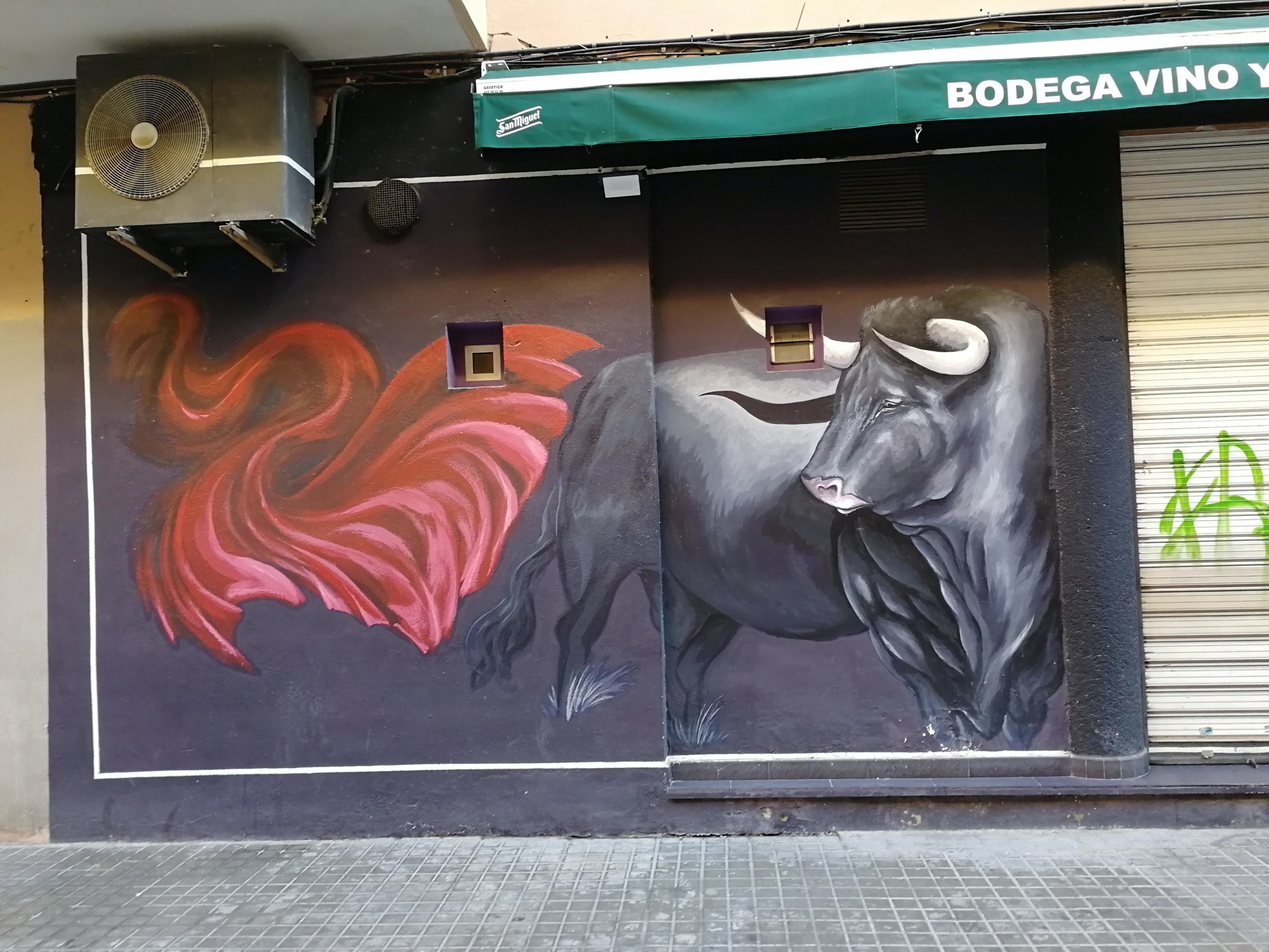 The artwork is of graffiti type. You can admire it in the city of València in Spain and more precisely here : Carrer del Dr. Manuel Candela, 71, 46021 València, Valencia, Espagne.