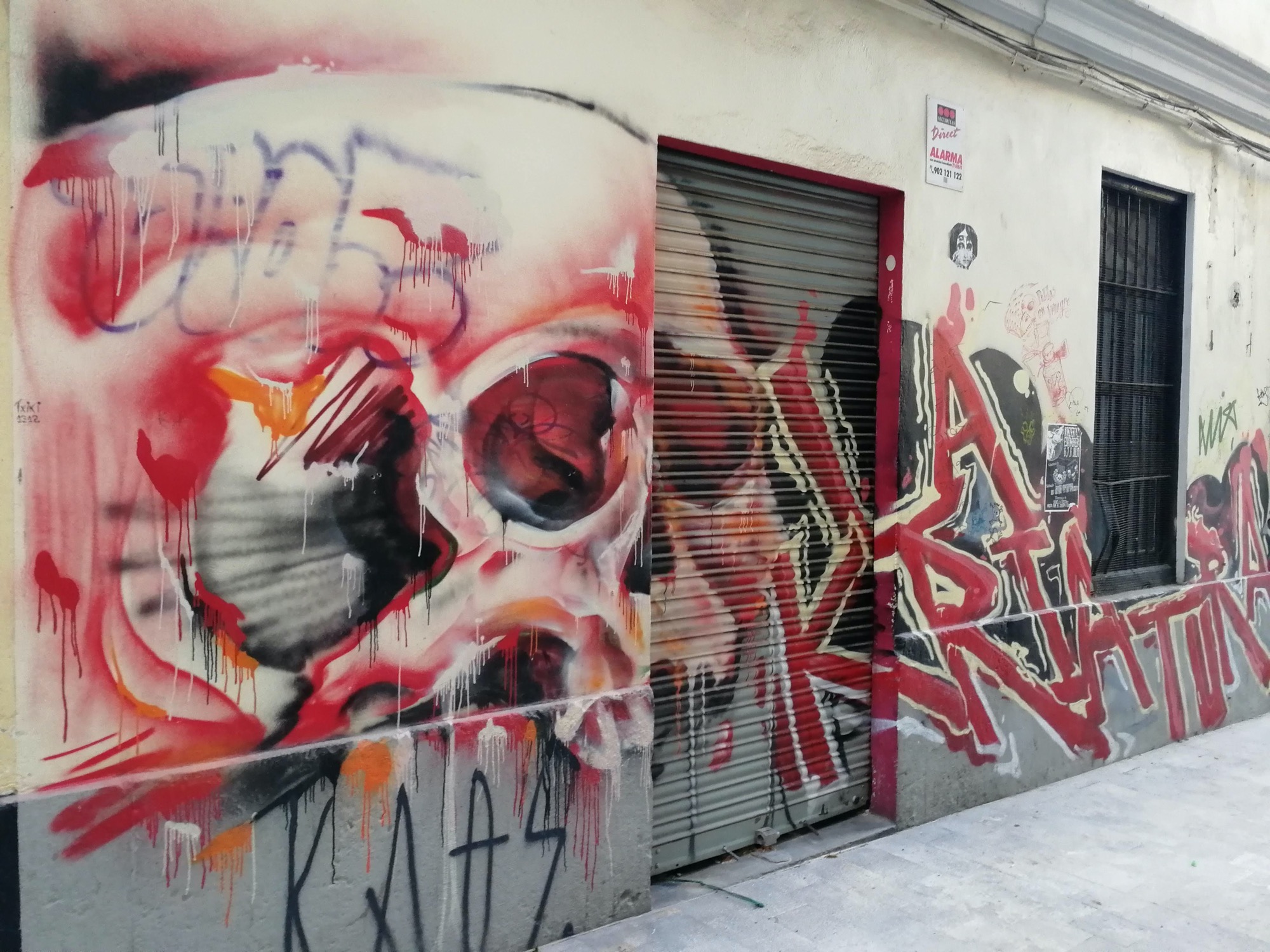 The artwork is of graffiti type. You can admire it in the city of València in Spain and more precisely here : Carrer de la Corona, 10, 46003 València, Valencia, Espagne.