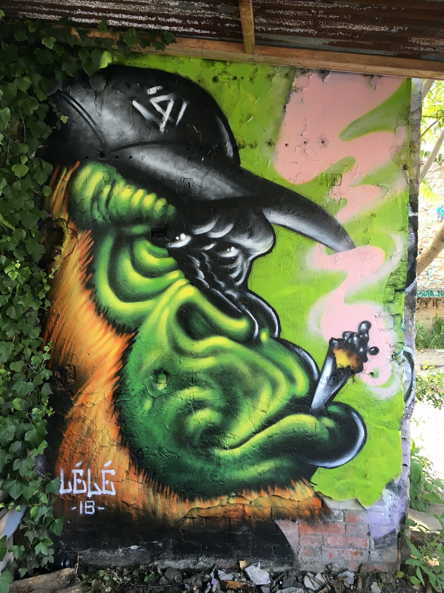 The artwork is of graffiti type. You can admire it in the city of Bordeaux in France and more precisely here : Darwin, bat. sud, 87 Quai des Queyries, 33100 Bordeaux, France.