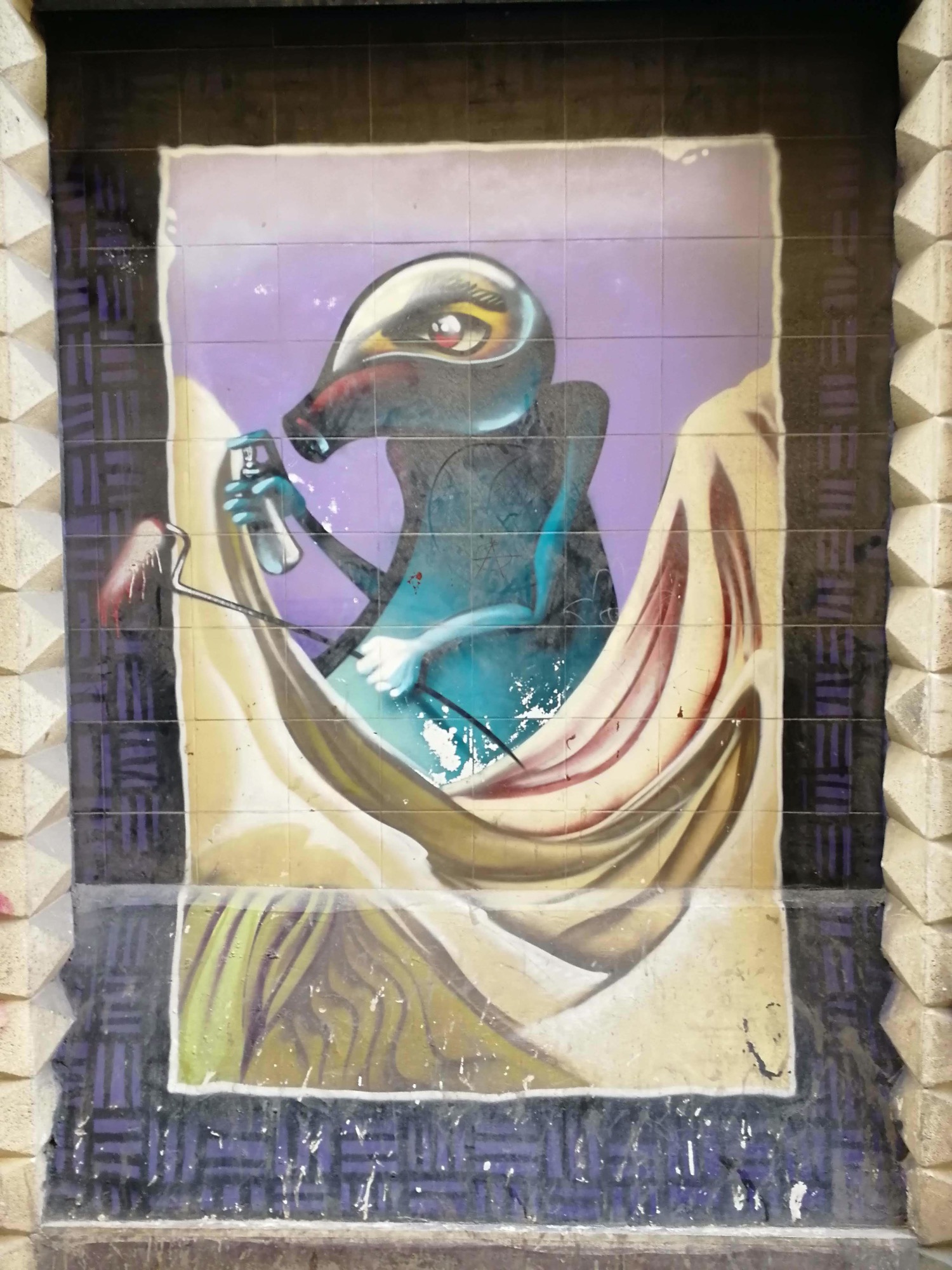 The artwork is of graffiti type. You can admire it in the city of València in Spain and more precisely here : Carrer de Balmes, 11, 46001 València, Valencia, Espagne.