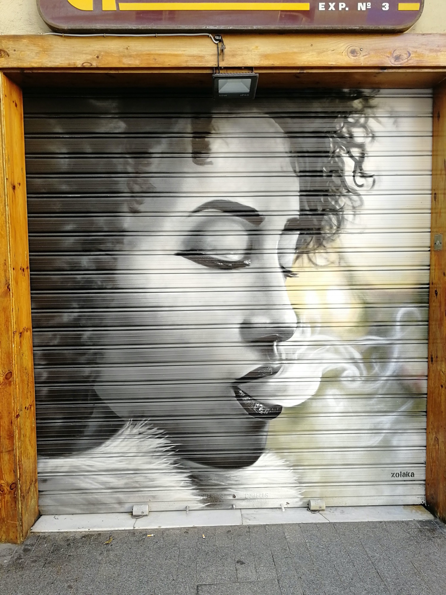 The artwork is of graffiti type. You can admire it in the city of València in Spain and more precisely here : Plaça de Manises, 20, 46003 València, Valencia, Espagne.