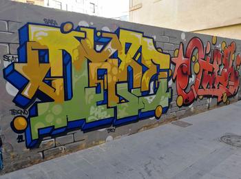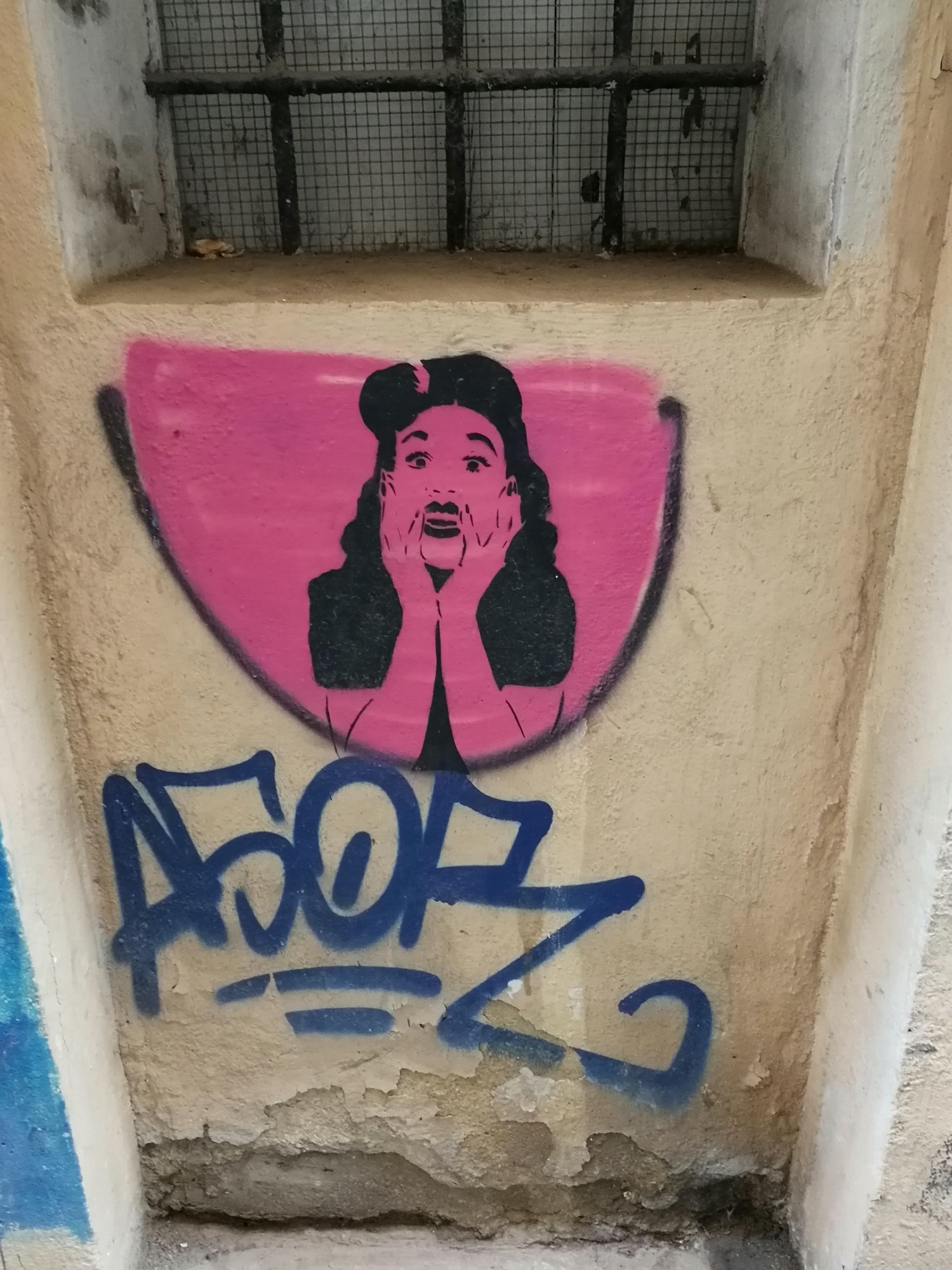 The artwork is of graffiti type. You can admire it in the city of València in Spain and more precisely here : Plaça del Carme, 4, 46003 València, Valencia, Espagne.