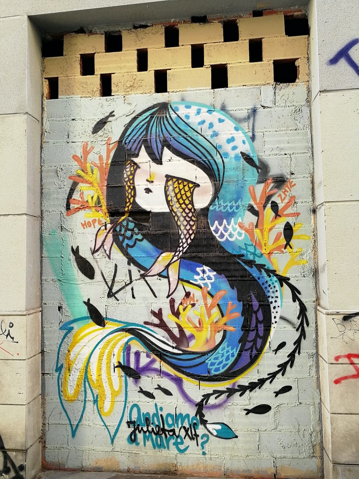 The artwork is of graffiti type. You can admire it in the city of València in Spain and more precisely here : Carrer del Pintor Domingo, 21, 46001 València, Valencia, Espagne.