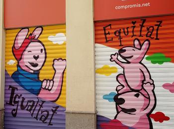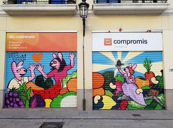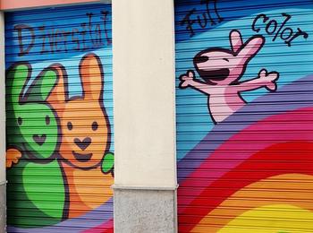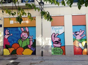 The artwork is of graffiti type. You can admire it in the city of València in Spain and more precisely here : Carrer del Forn de l'Hospital, 6, 46001 València, Valencia, Espagne.