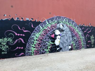 The artwork is of type graffiti. You can admire it in the city of València in Spain, more precisely here: Carrer de la República de la Costa d'Ivori, 6, 46017 València, Valencia, Espagne.