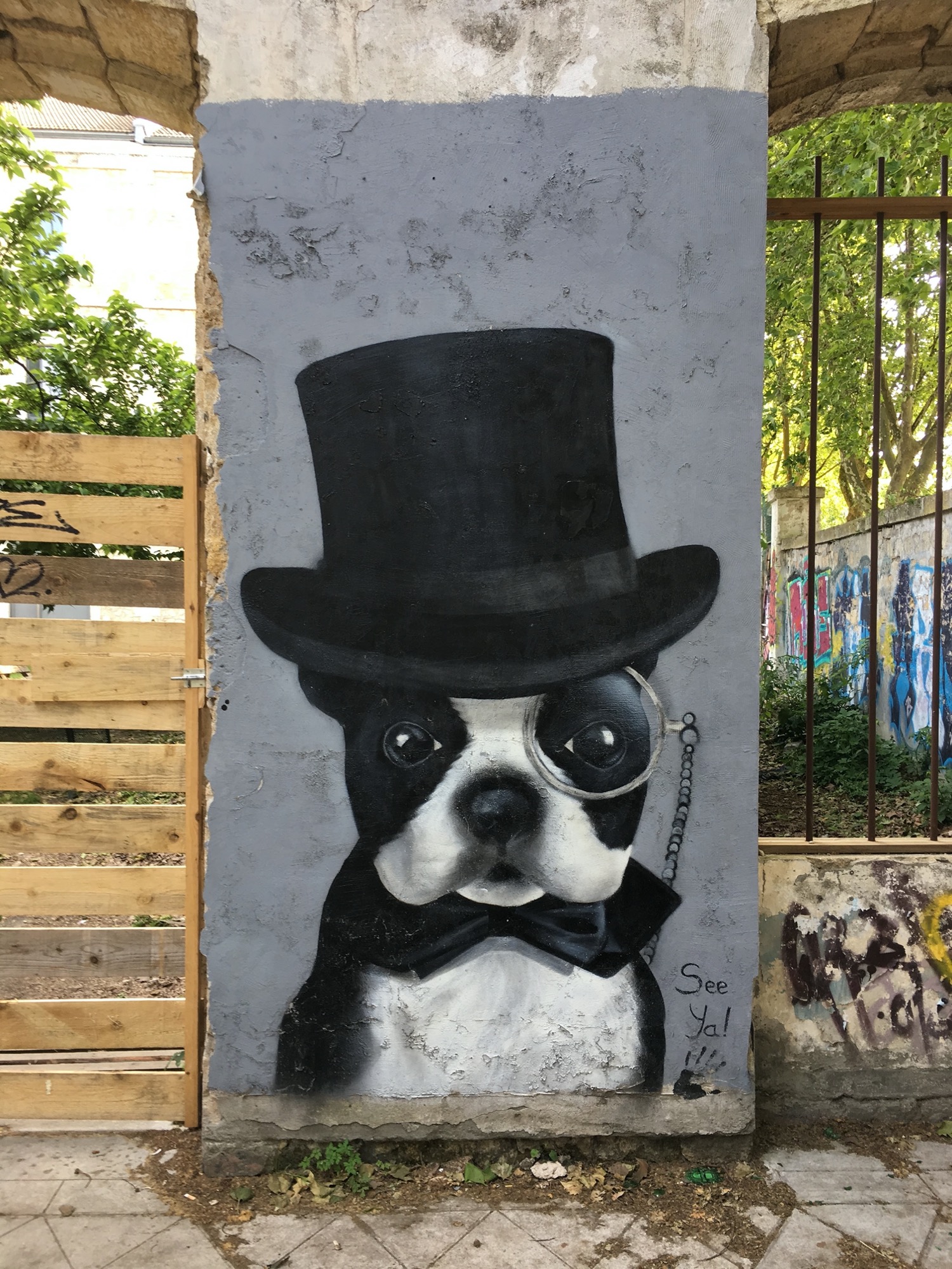 The artwork is of graffiti type. You can admire it in the city of Bordeaux in France and more precisely here : Darwin, bat. sud, 87 Quai des Queyries, 33100 Bordeaux, France.