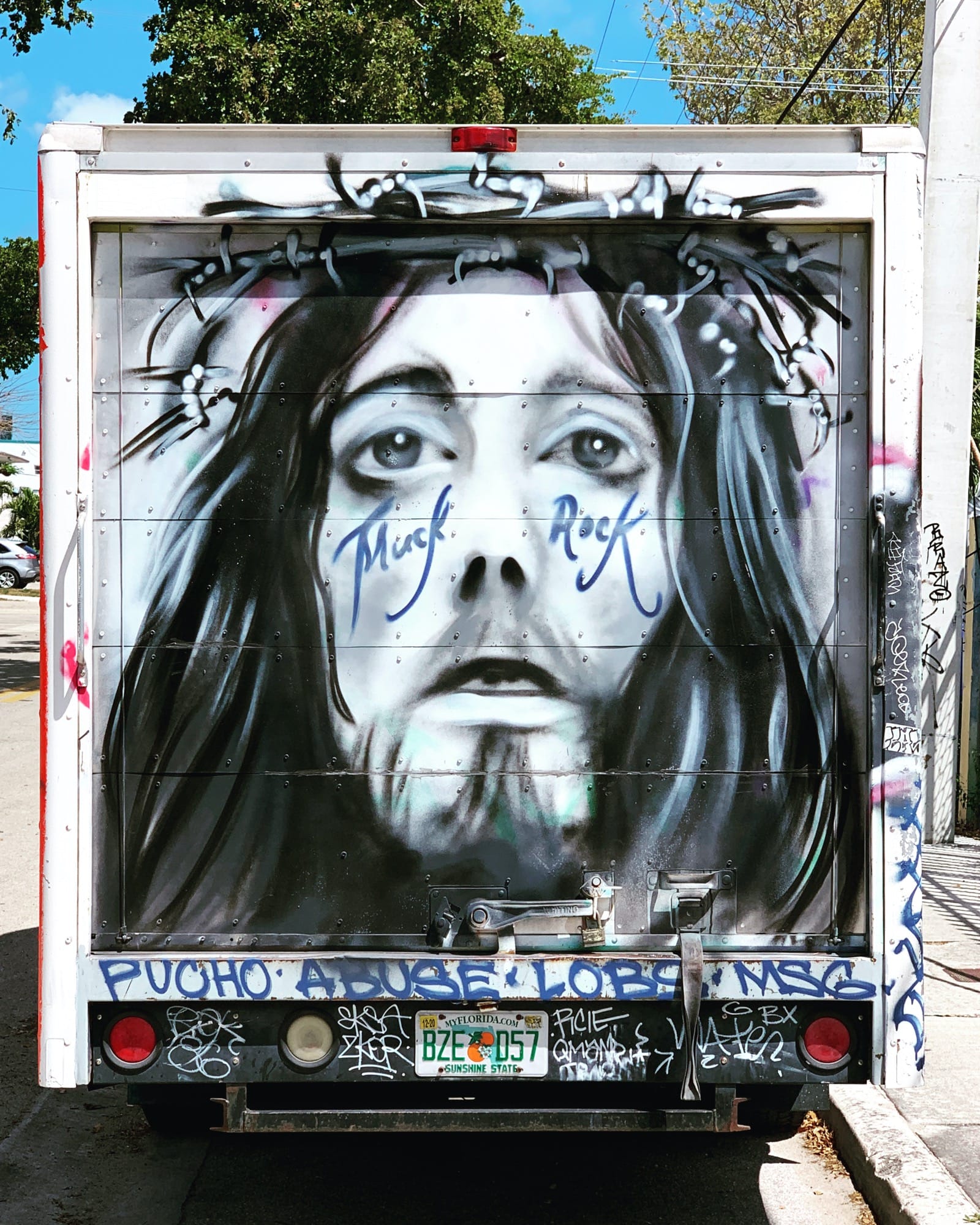 The artwork is of graffiti type. You can admire it in the city of Miami in United States and more precisely here : 520 NW 30th St, Miami, FL 33127, USA.