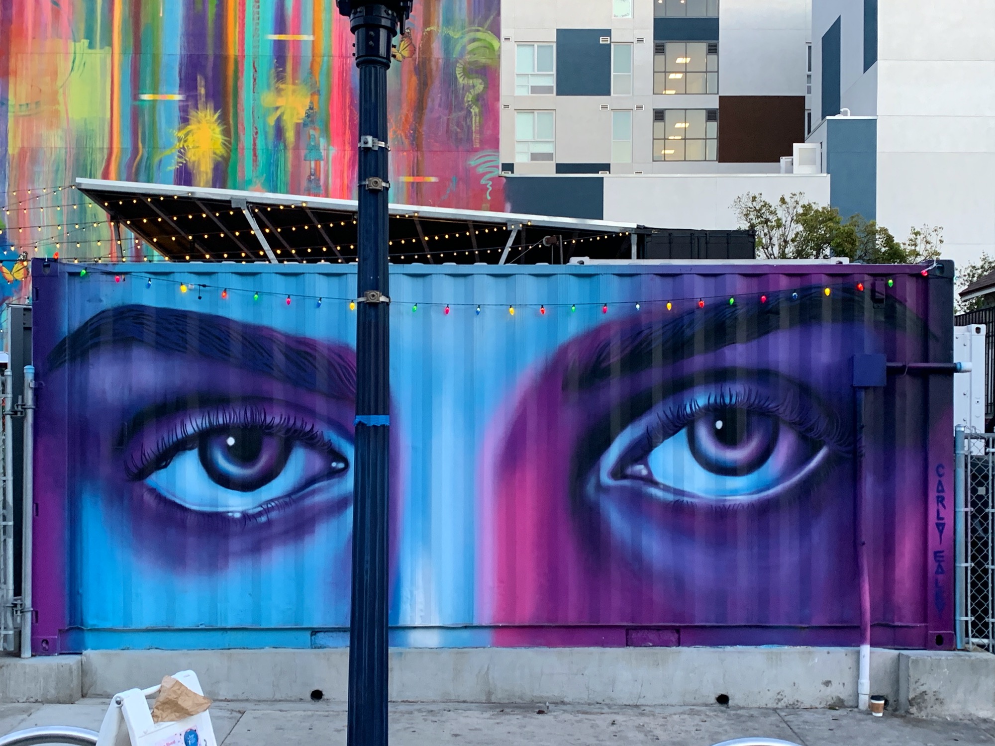 The artwork is of graffiti type. You can admire it in the city of San Diego in United States and more precisely here : 1301 Market St, San Diego, CA 92101, USA.