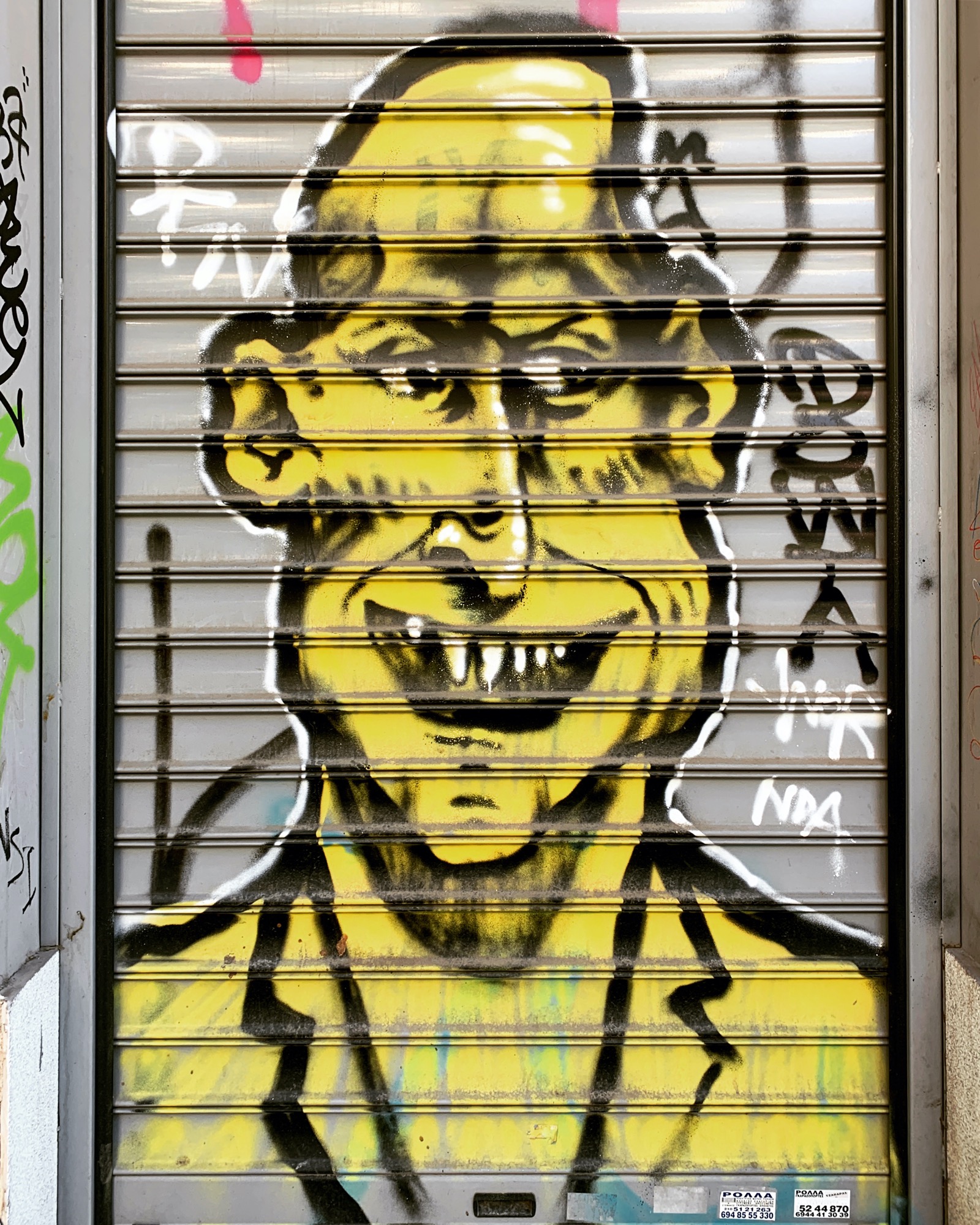 The artwork is of graffiti type. You can admire it in the city of Athina in Greece and more precisely here : Ag. Asomaton 35, Athina 105 53, Greece.