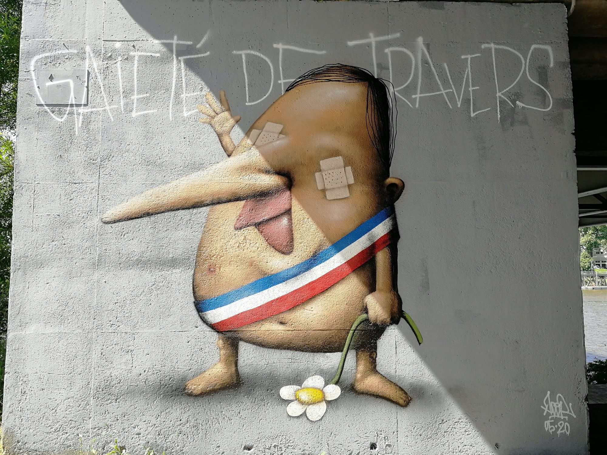 The artwork Gaité de travers is of graffiti type. You can admire it in the city of Nantes in France and more precisely here : Pont Willy Brandt, 44200 Nantes, France.