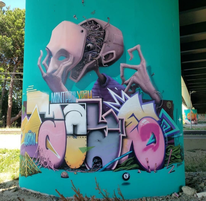 The artwork Maye is of graffiti type. You can admire it in the city of Montpellier in France and more precisely here : Avenue de la mer raymond dugrand.