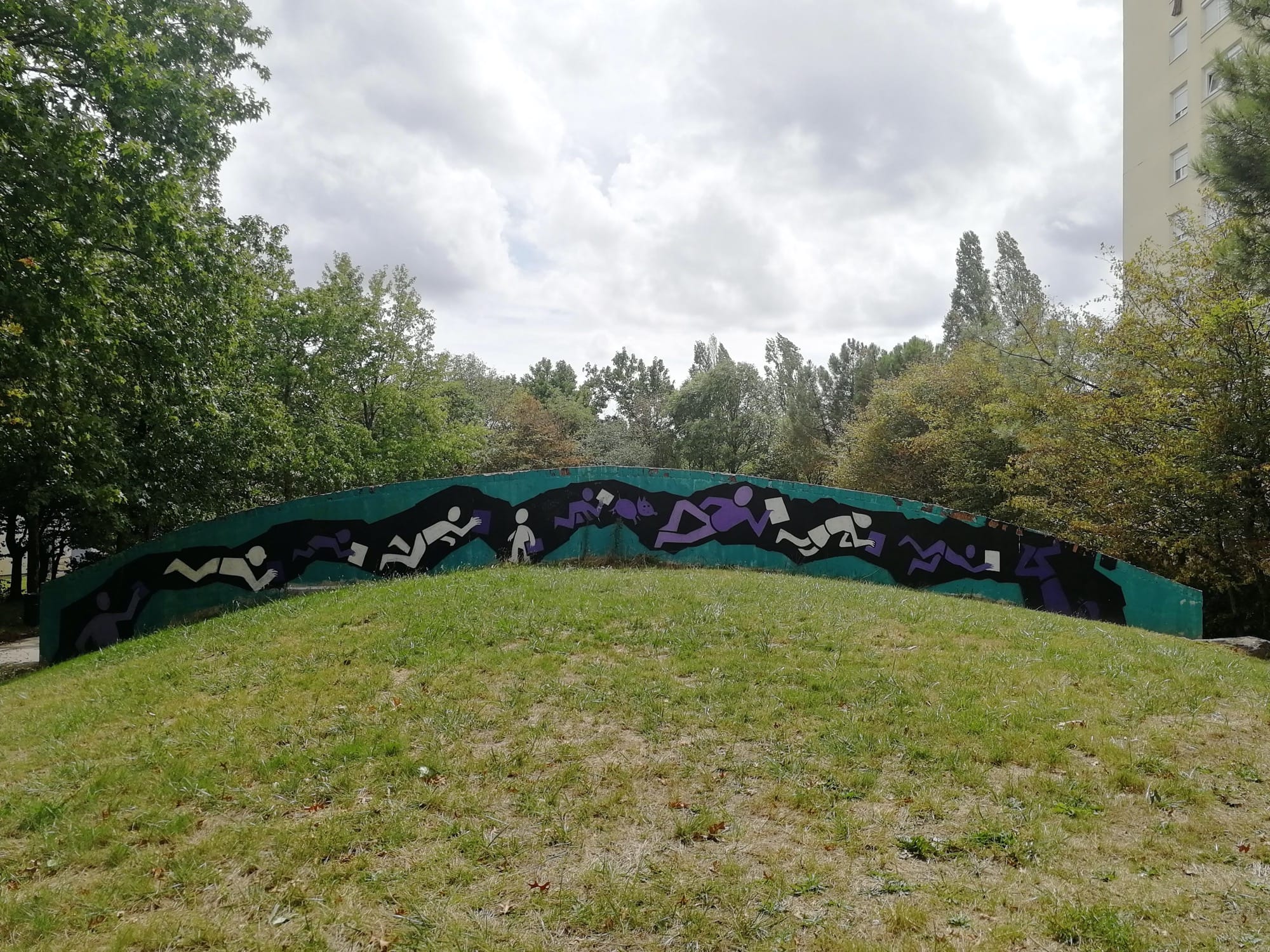 The artwork is of graffiti type. You can admire it in the city of Nantes in France and more precisely here : 2 Rue Samuel de Champlain, 44300 Nantes, France.