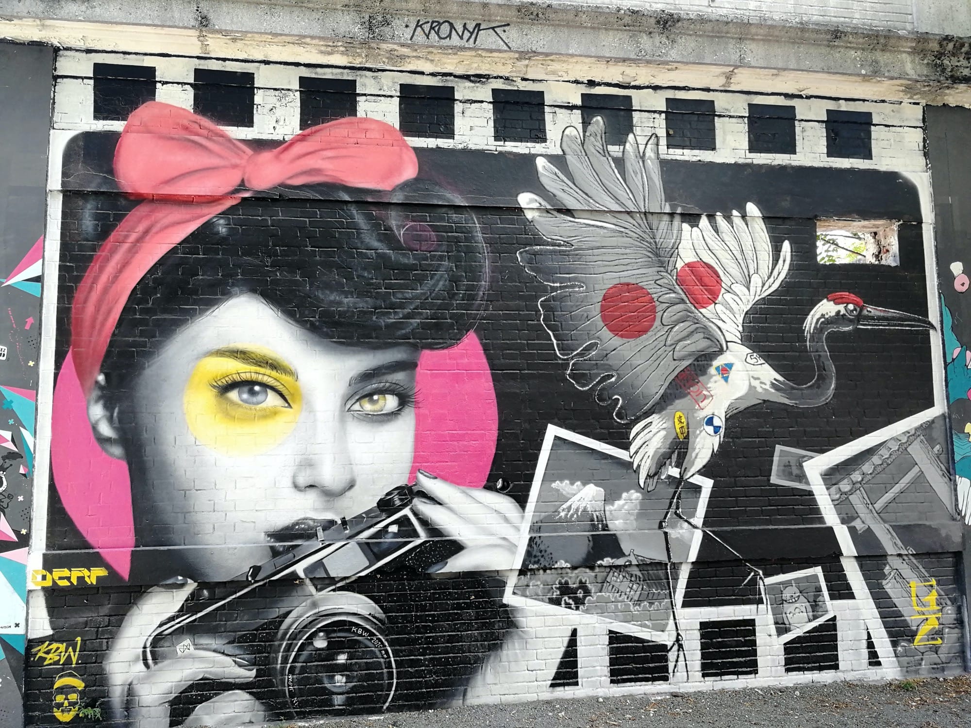 The artwork is of graffiti type. You can admire it in the city of Bordeaux in France and more precisely here : Darwin, bat. sud, 87 Quai des Queyries, 33100 Bordeaux, France.