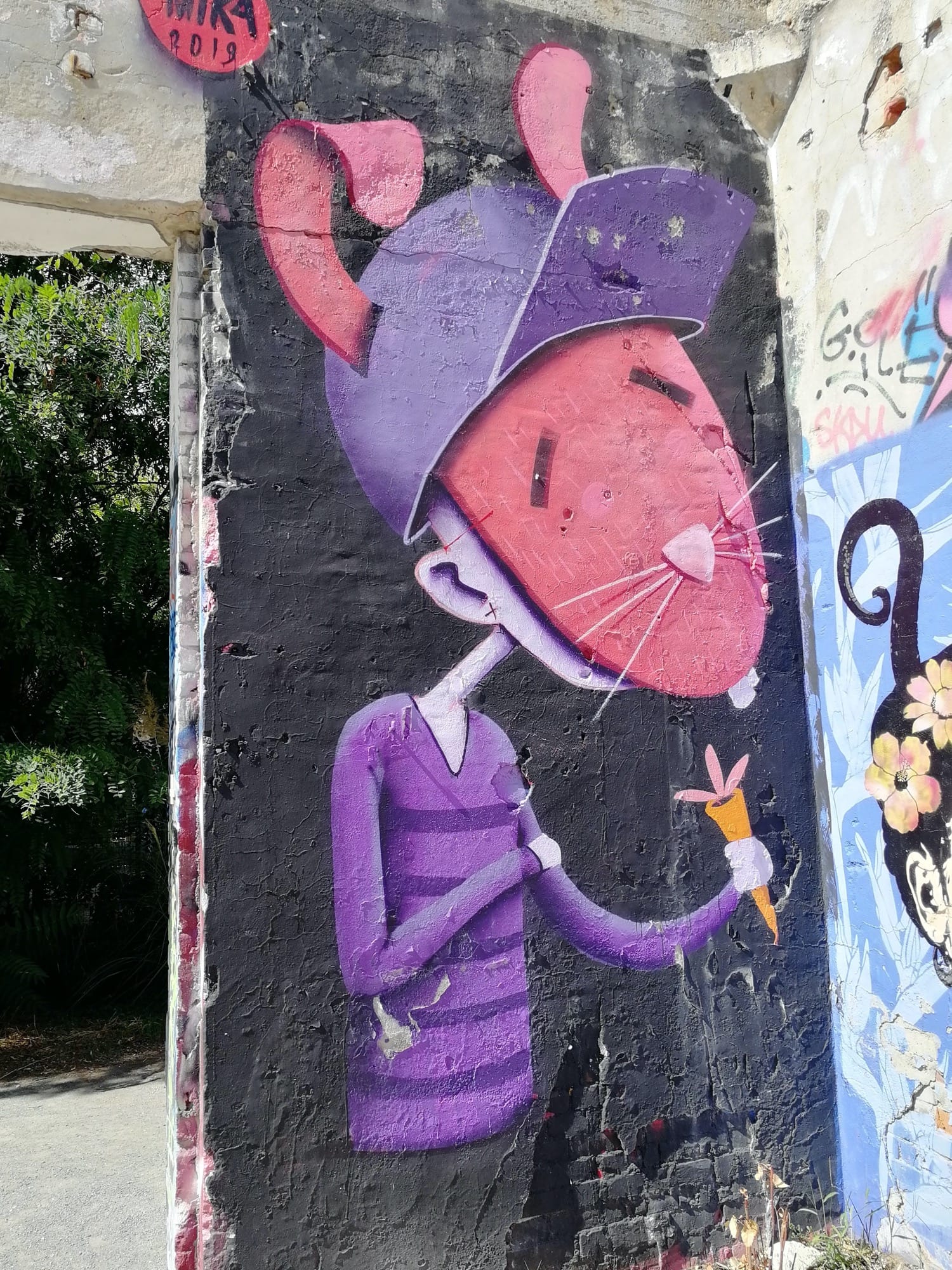 The artwork is of graffiti type. You can admire it in the city of Bordeaux in France and more precisely here : Darwin, bat. sud, 87 Quai des Queyries, 33100 Bordeaux, France.