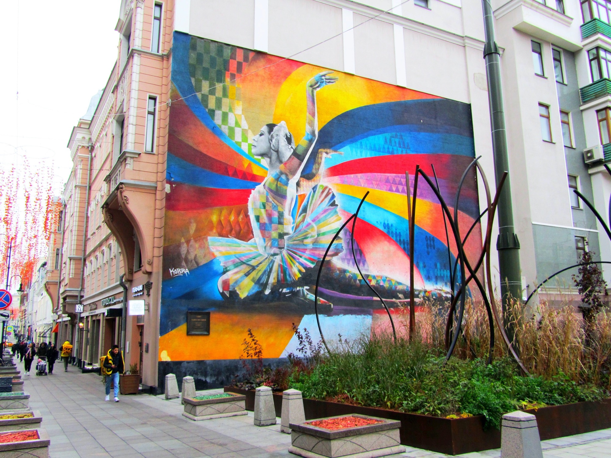 The artwork Maya Plisetskaya is of graffiti type. You can admire it in the city of Moscow in Russia and more precisely here : 16 Bolshaya Dmitrovka st., 125009 Moscow, Russia.
