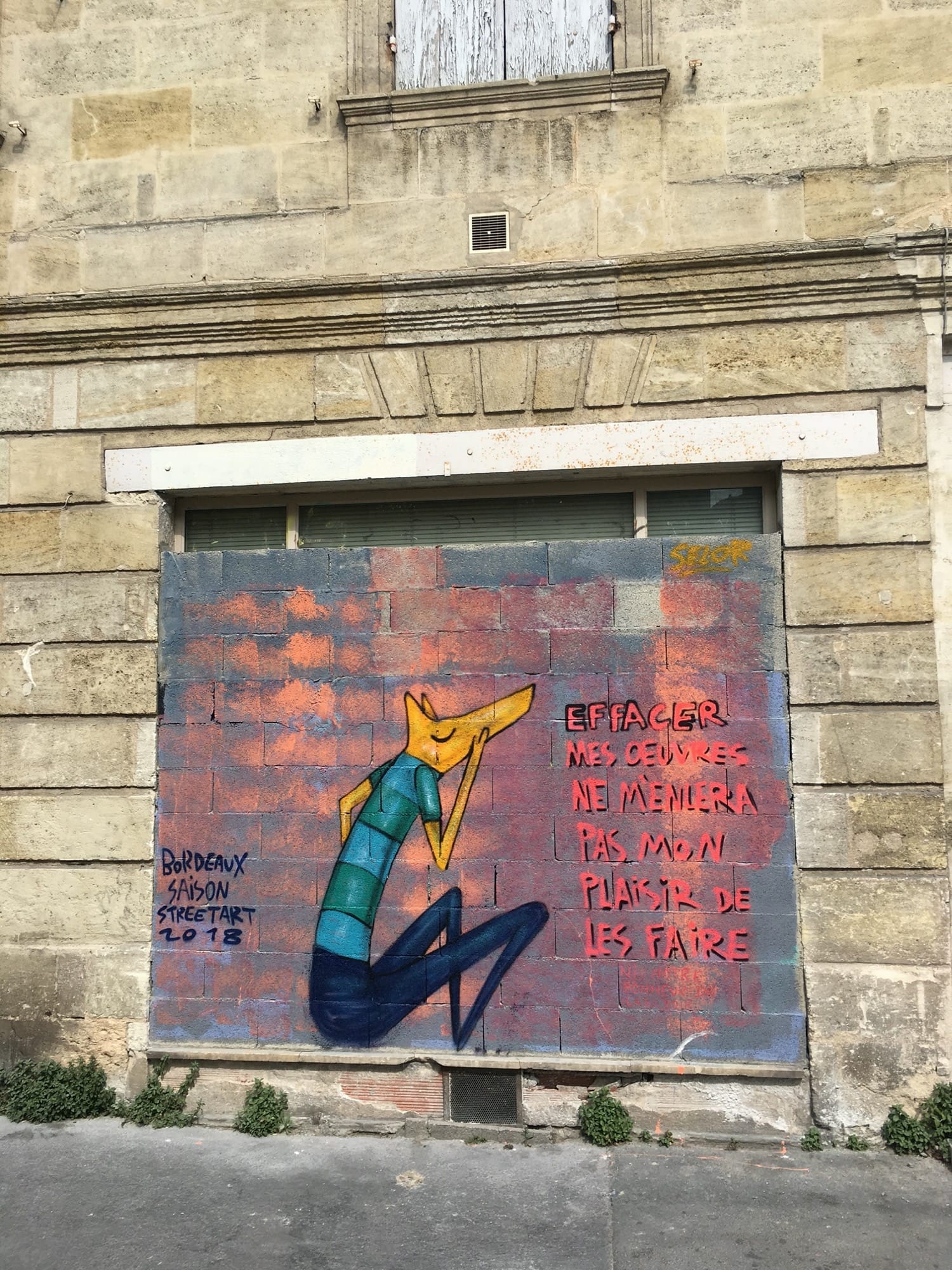 The artwork is of graffiti type. You can admire it in the city of Bordeaux in France and more precisely here : 1 Rue Planterose, 33800 Bordeaux, France.