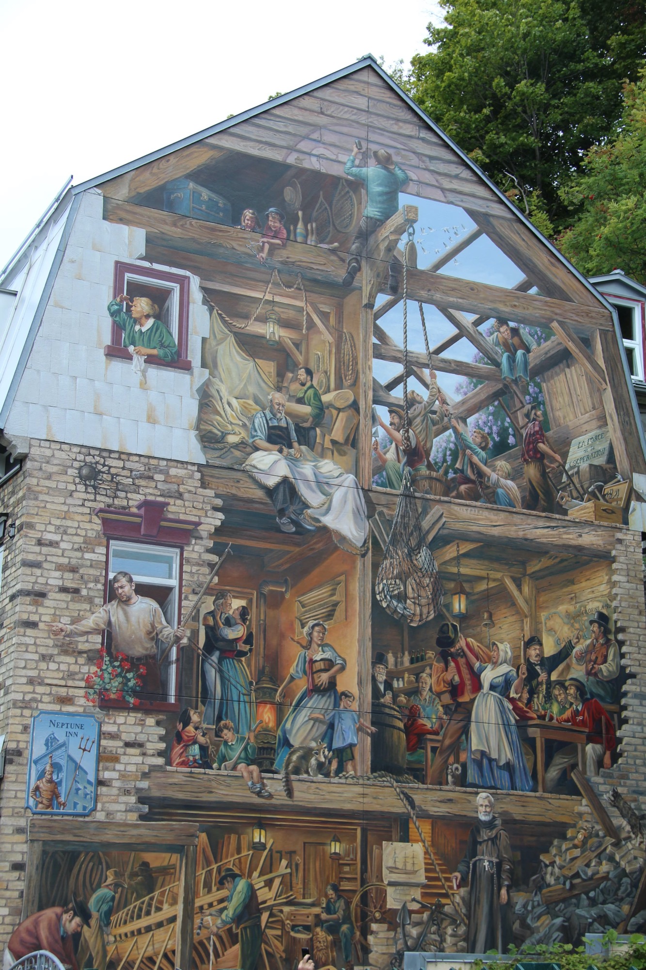 The artwork is of graffiti type. You can admire it in the city of Québec in Canada and more precisely here : 104 Rue du Petit Champlain, Québec, QC G1K 4H4, Canada.