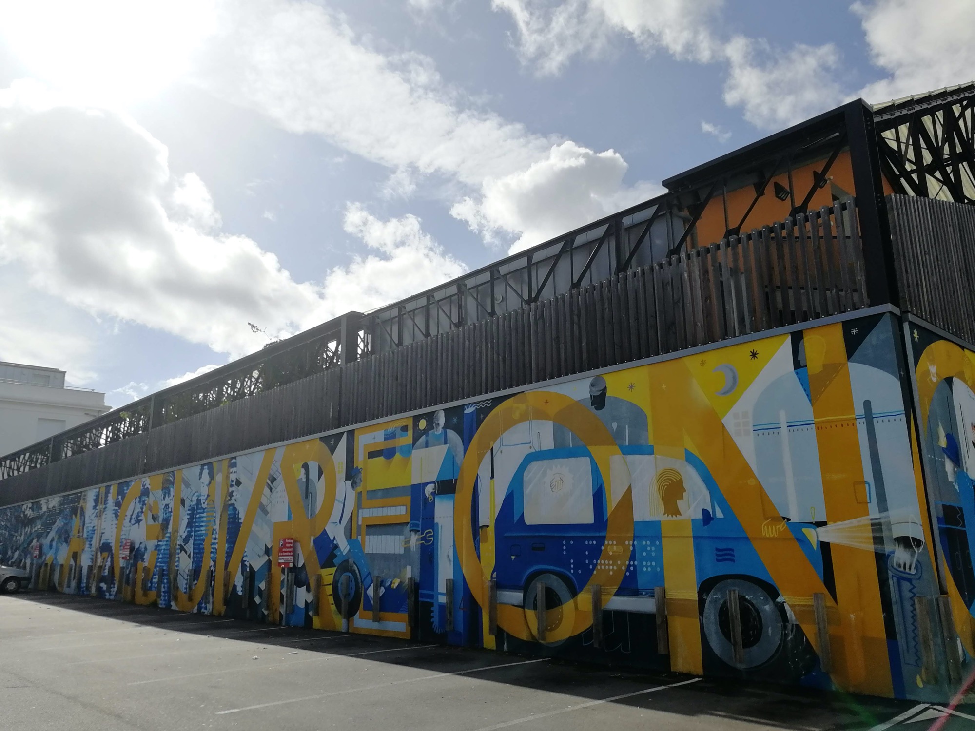 The artwork is of graffiti type. You can admire it in the city of Nantes in France and more precisely here : 10 Prom. des Nefs, 44100 Nantes, France.