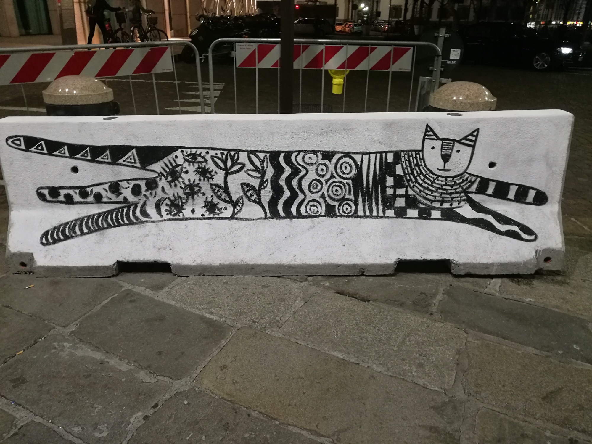 The artwork Il gatto lungo is of graffiti type. You can admire it in the city of Milano in Italy and more precisely here : 1 Via Carlo Maria Martini.