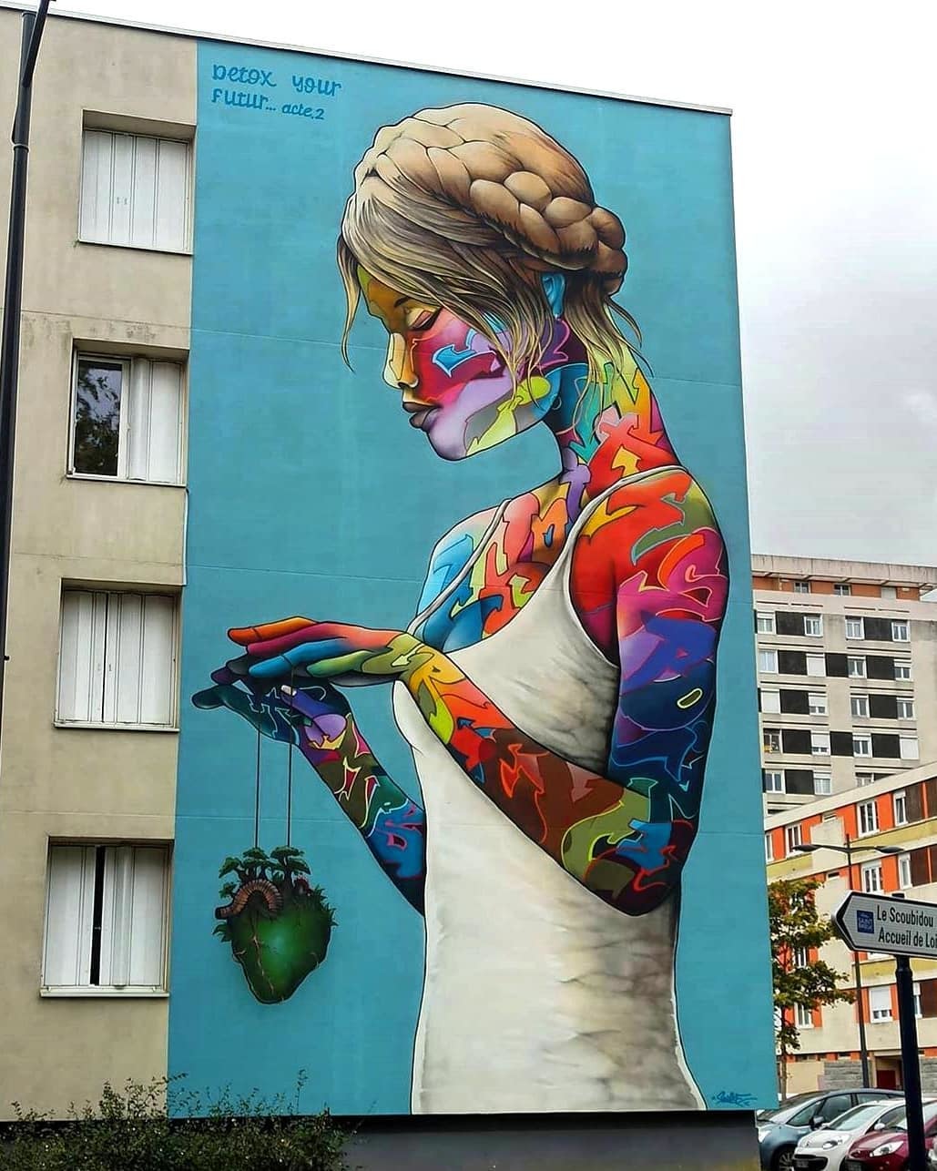 The artwork is of graffiti type. You can admire it in the city of Saint-Brieuc in France and more precisely here : 1 Rue de Liège, 22000 Saint-Brieuc, France.