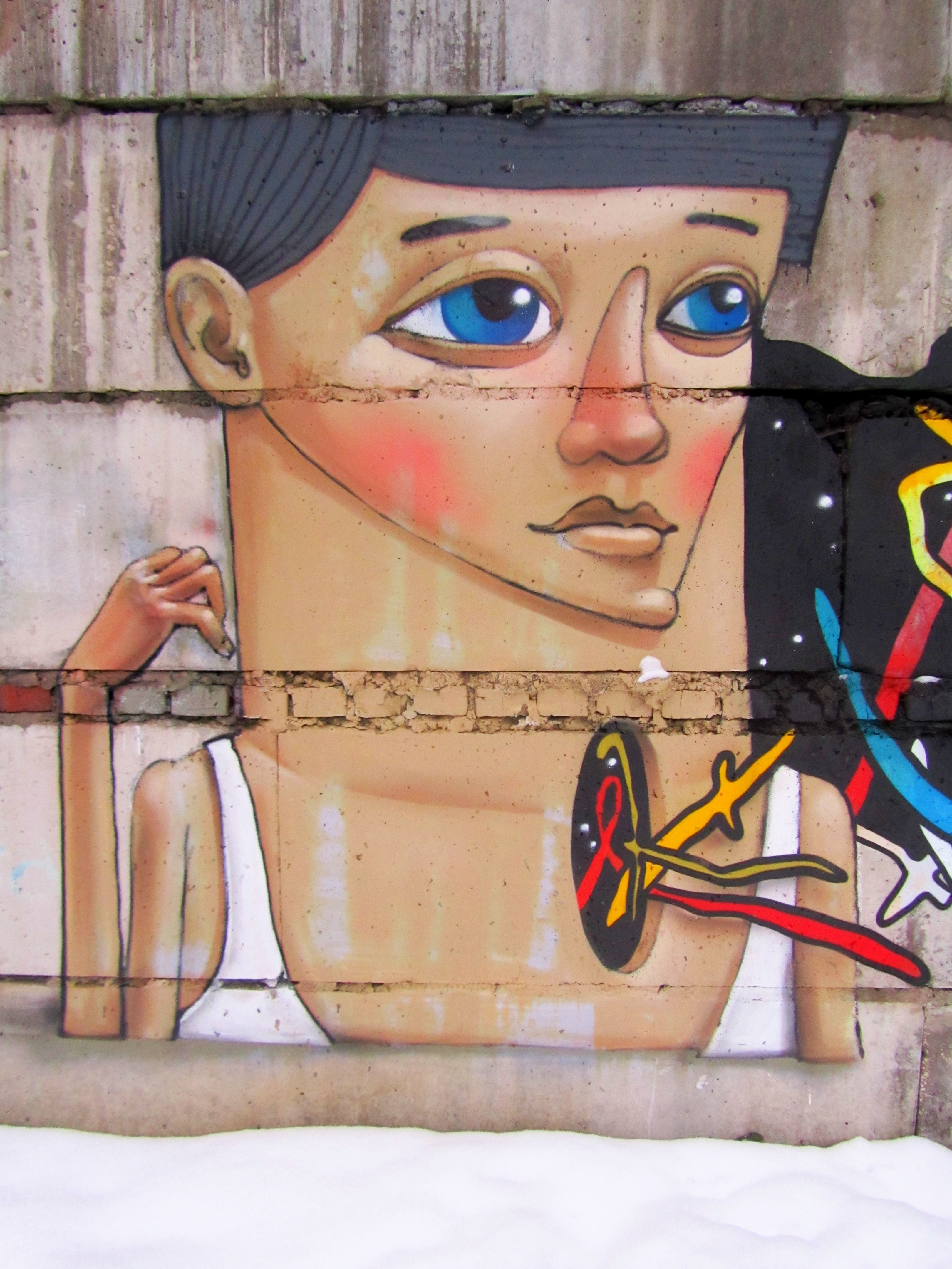 The artwork is of graffiti type. You can admire it in the city of Moscow in Russia and more precisely here : 30-5 Izmailovskiy Val st., 107023 Moscow, Russia.