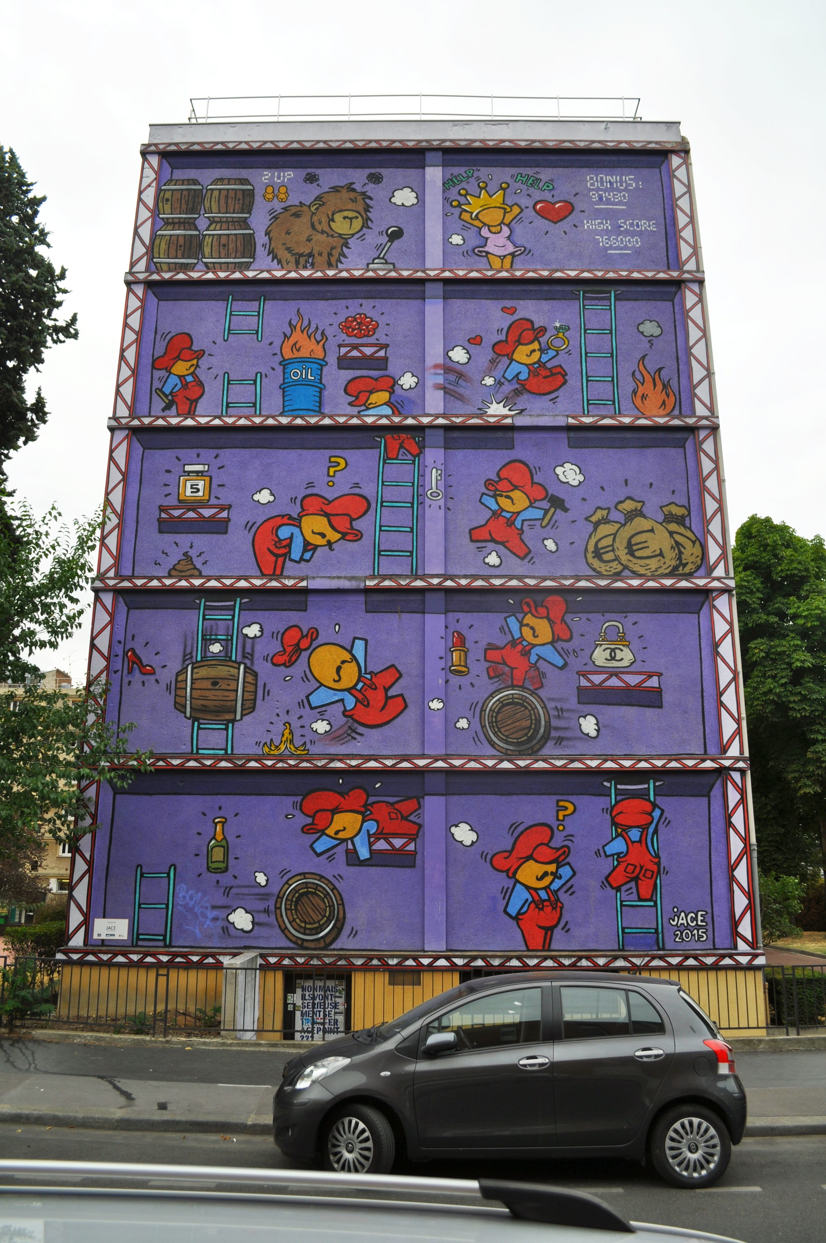 The artwork is of graffiti type. You can admire it in the city of Paris in France and more precisely here : 61 Rue du Moulinet, 75013 Paris, France.
