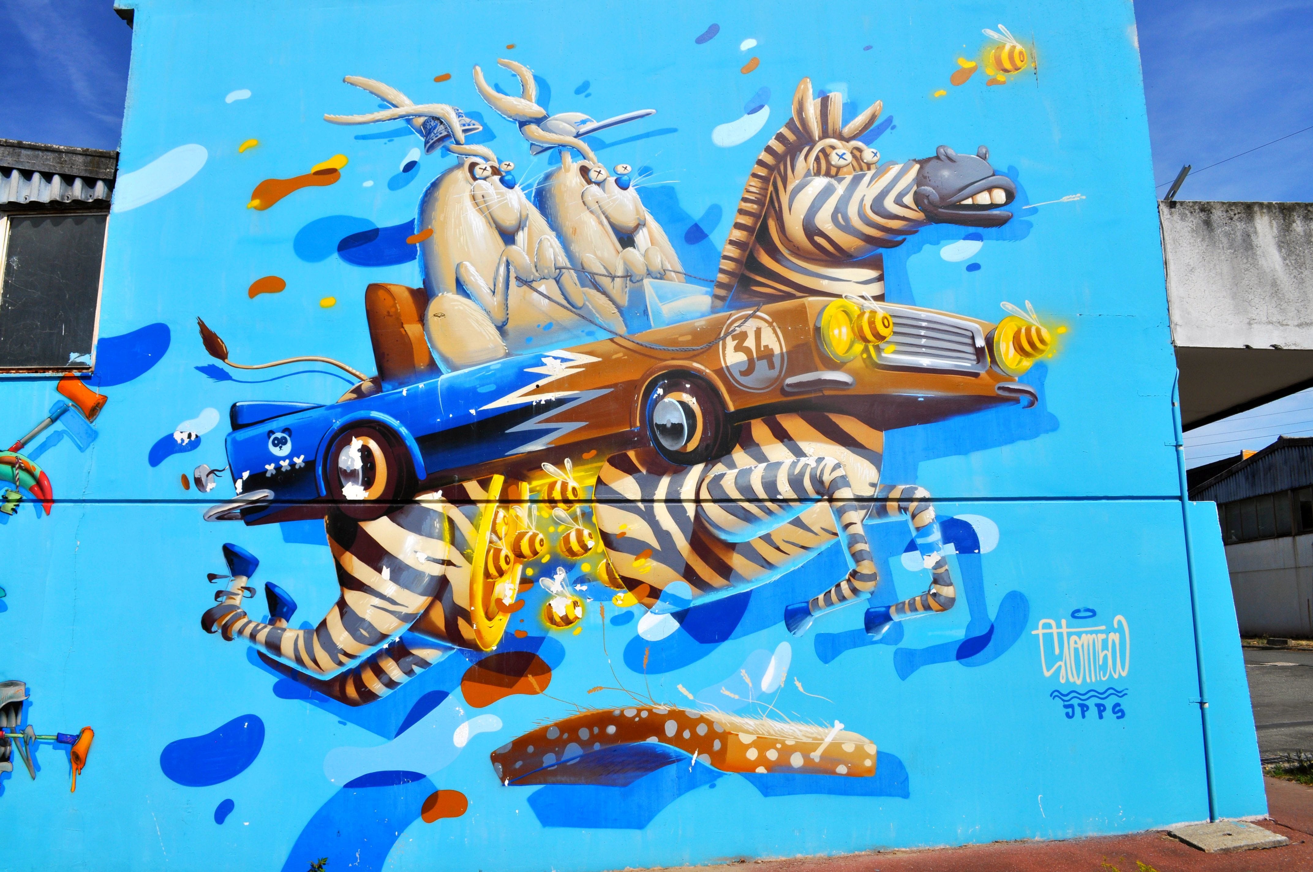The artwork is of graffiti type. You can admire it in the city of Cergy in France and more precisely here : 55 Rue Francis Combe, 95000 Cergy, France.