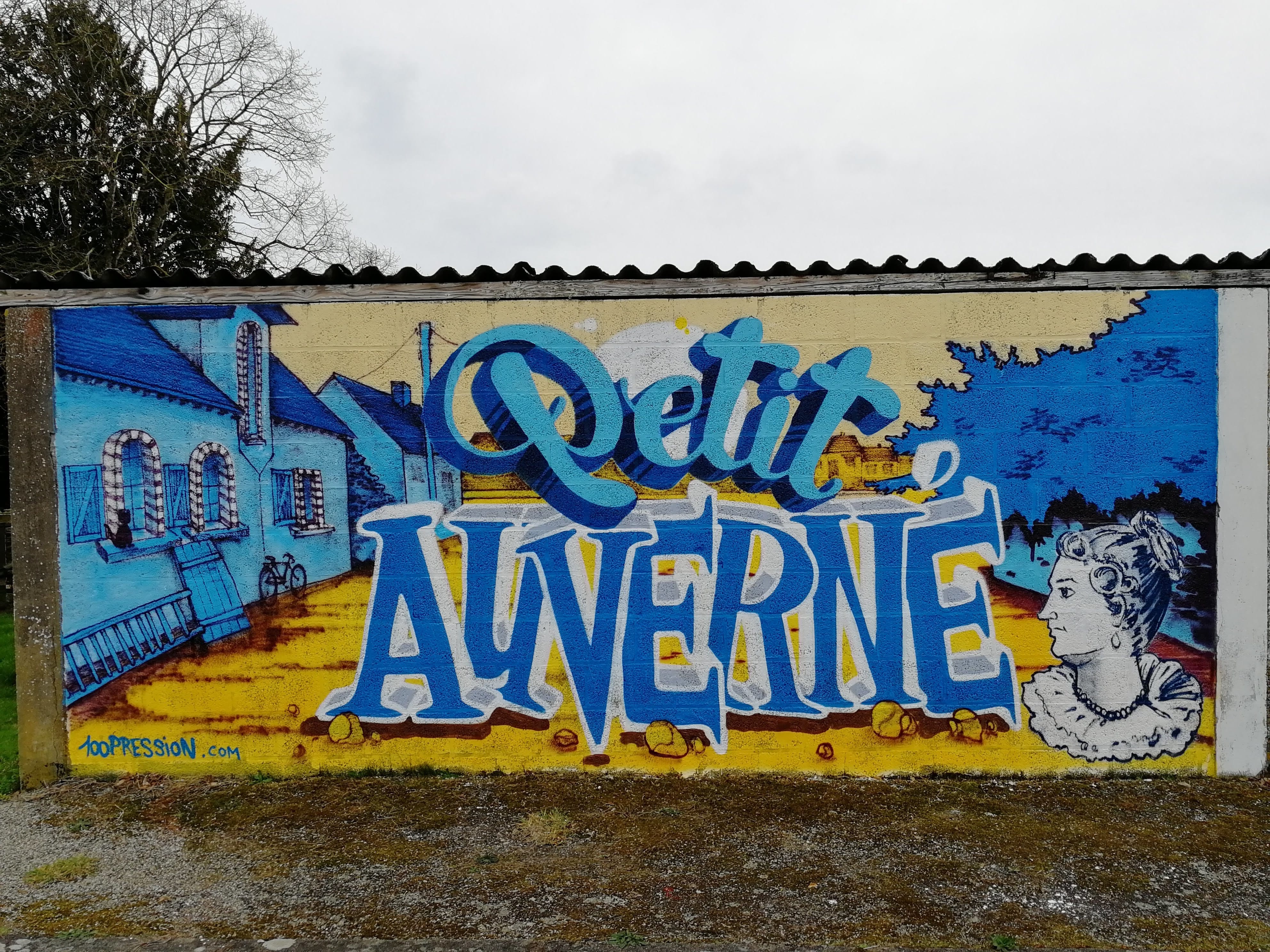The artwork is of graffiti type. You can admire it in the city of Petit-Auverné in France and more precisely here : 2 Rue de l'Abbé Simon Thoreau, 44670 Petit-Auverné, France.
