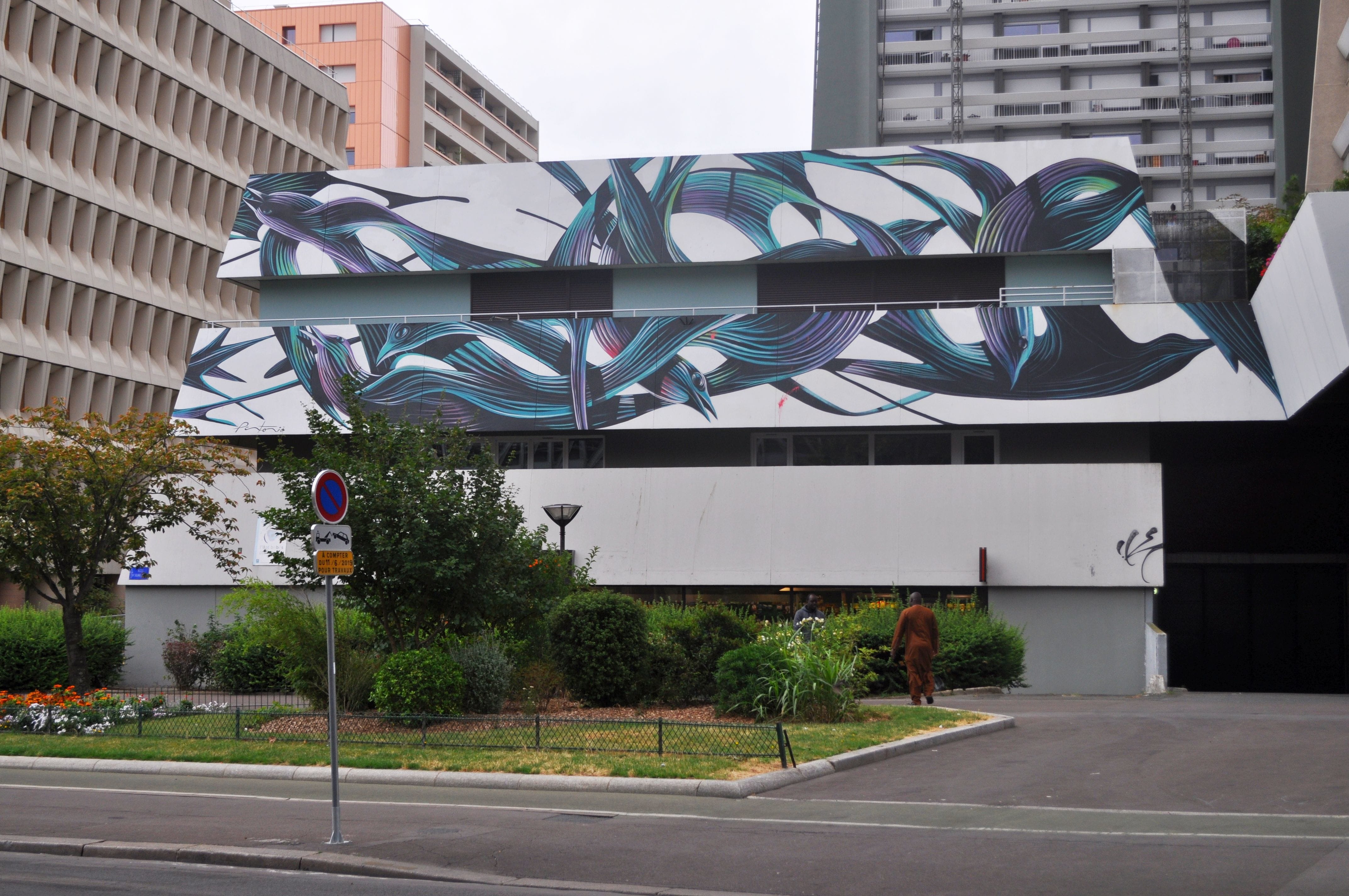 The artwork is of graffiti type. You can admire it in the city of Paris in France and more precisely here : 91 bld Vincent Auriol, 75013 Paris, France.