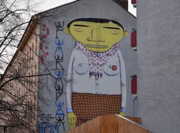 The artwork is of graffiti type. You can admire it in the city of Berlin in Germany and more precisely here : Oppelner Str. 3, 10997 Berlin, Germany.