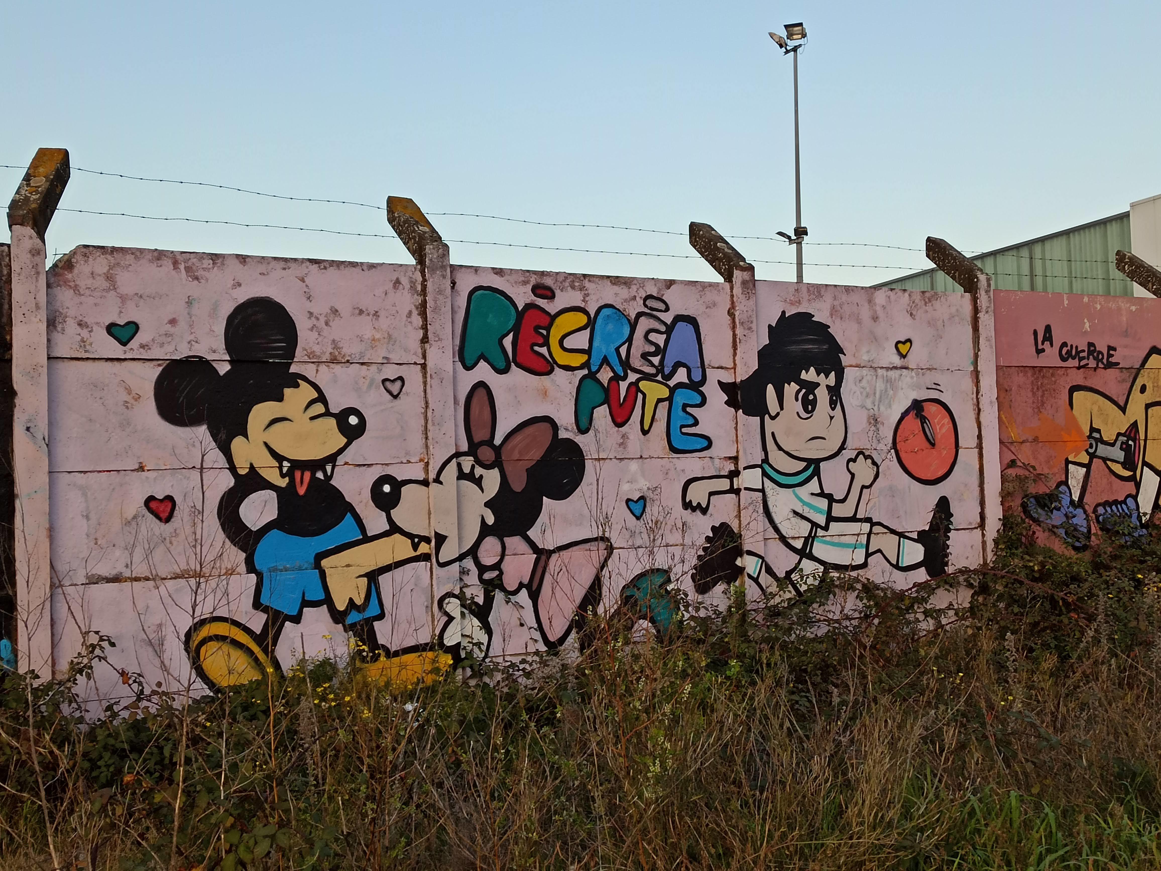 The artwork Récréa pute is of graffiti type. You can admire it in the city of Nantes in France and more precisely here : 33 Boulevard Benoni Goullin, 44200 Nantes, France.
