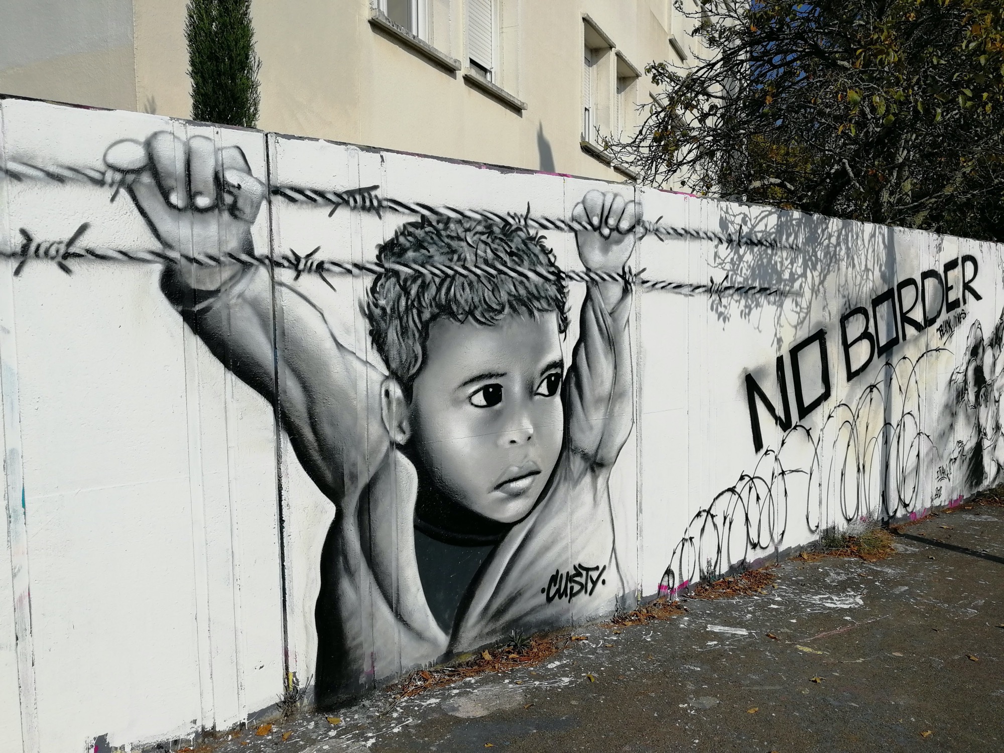 The artwork is of graffiti type. You can admire it in the city of Nantes in France and more precisely here : 8 Rue Ursule Chevalier, 44100 Nantes, France.