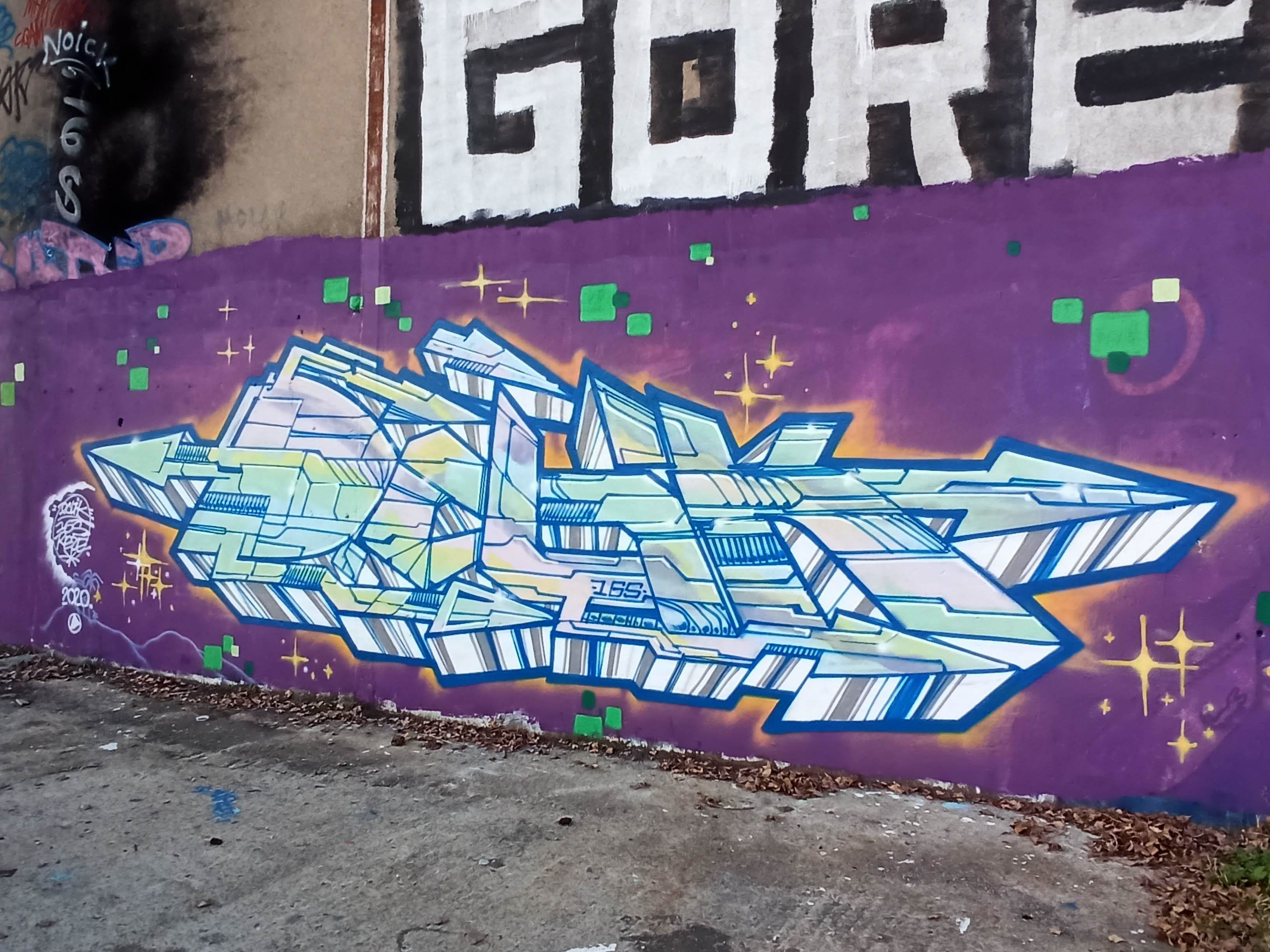 The artwork is of graffiti type. You can admire it in the city of Nantes in France and more precisely here : Cheminée Beghin-Say, 45 Boulevard Benoni Goullin, 44200 Nantes, France.