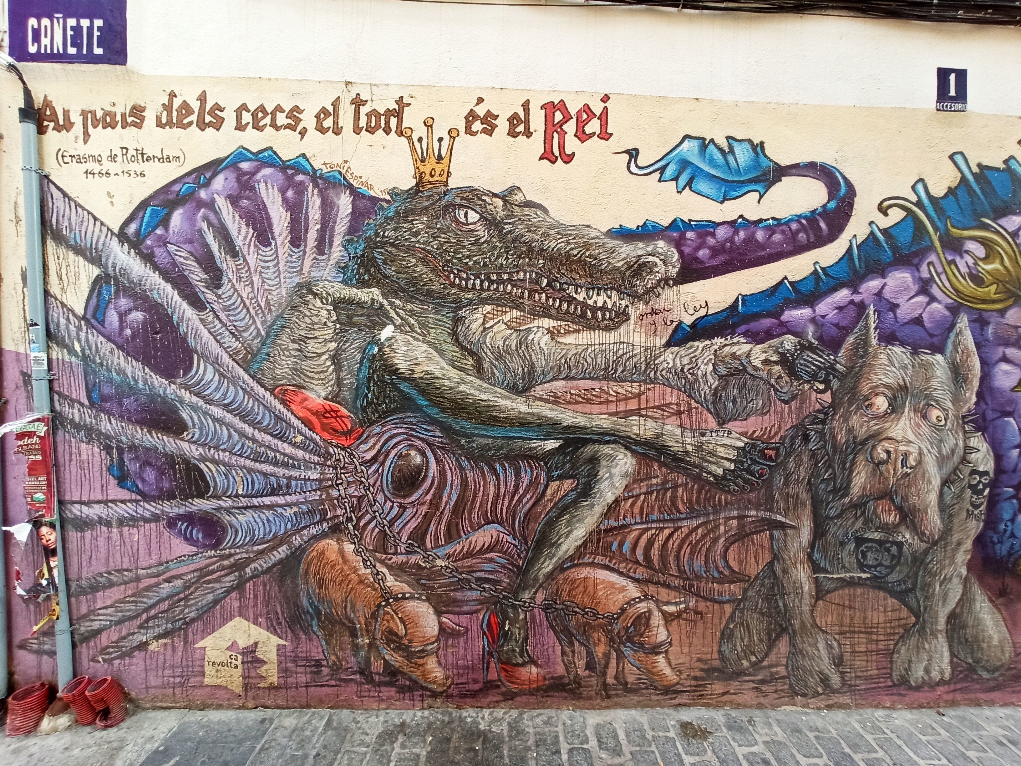 The artwork is of graffiti type. You can admire it in the city of València in Spain and more precisely here : 1 Carrer de Cañete, 46003 València, Spain.