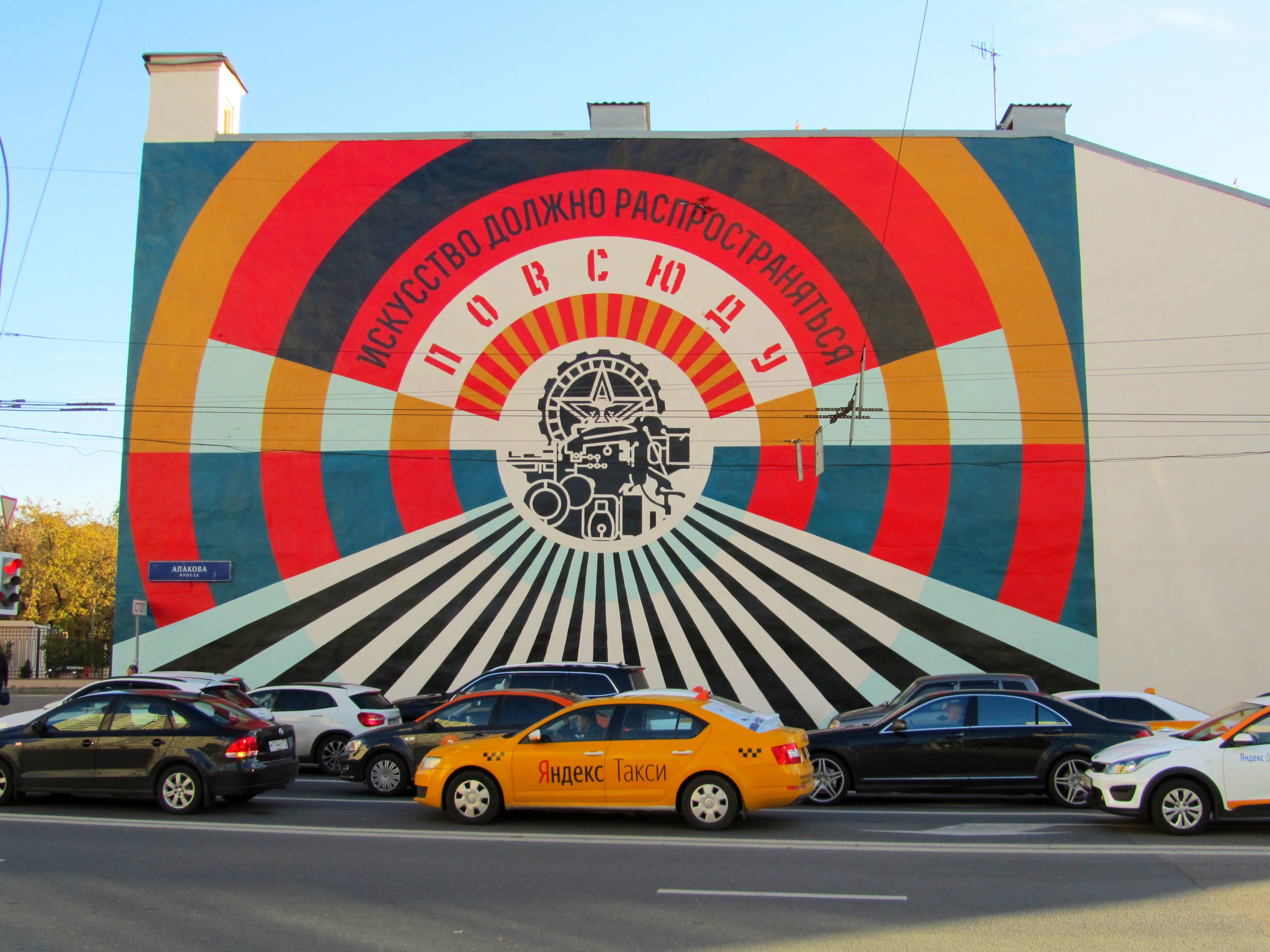 The artwork An Art should spread everywhere is of graffiti type. You can admire it in the city of Moscow in Russia and more precisely here : 12 Mytnaya st., 119049 Moscow, Russia.