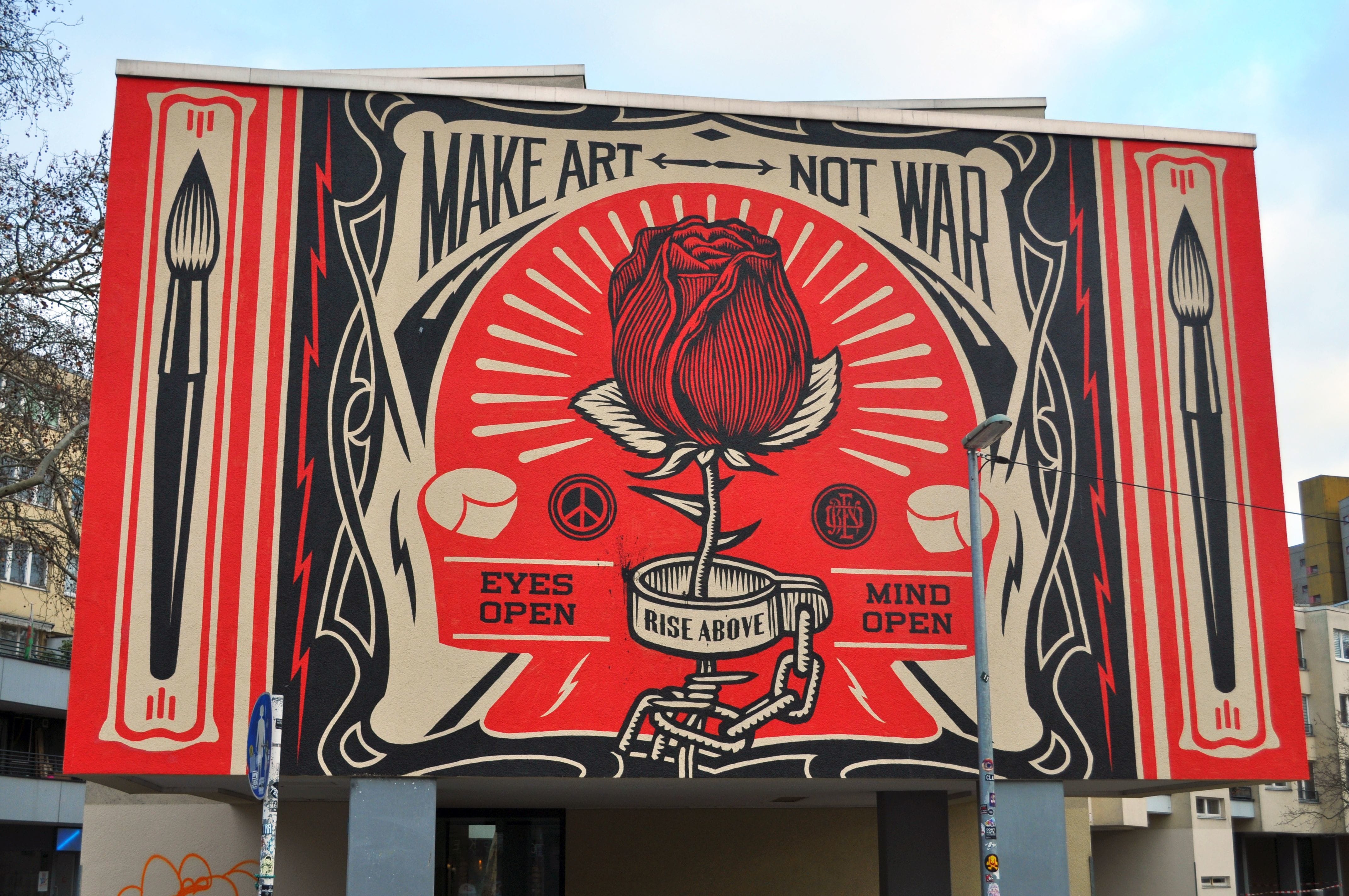 The artwork Make Art Not War is of graffiti type. You can admire it in the city of Berlin in Germany and more precisely here : 28 Mehringplatz, 10969 Berlin, Germany.