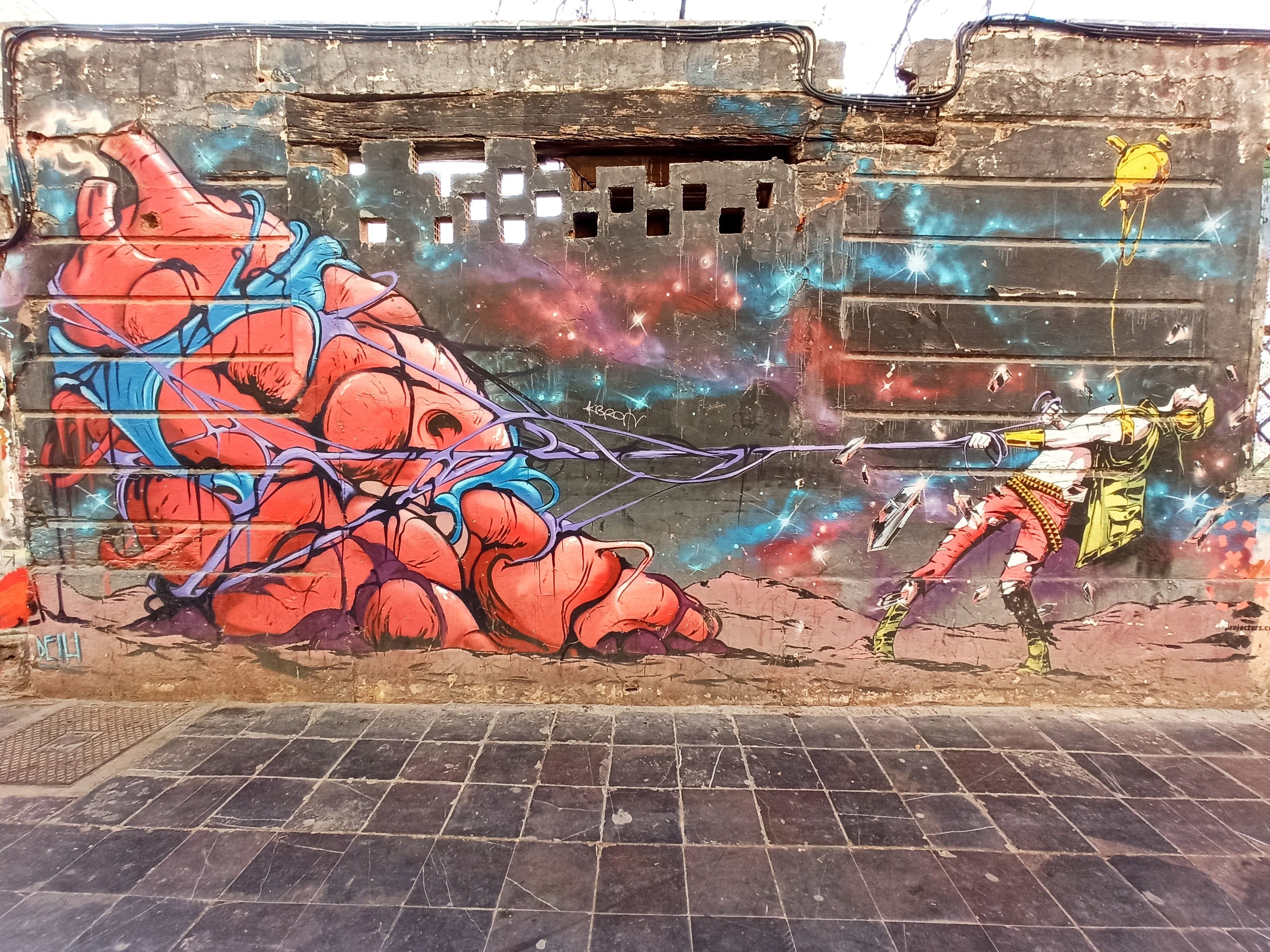The artwork is of graffiti type. You can admire it in the city of València in Spain and more precisely here : Carrer de Salvador Giner, 6, 46003 València, Valencia, Spain.