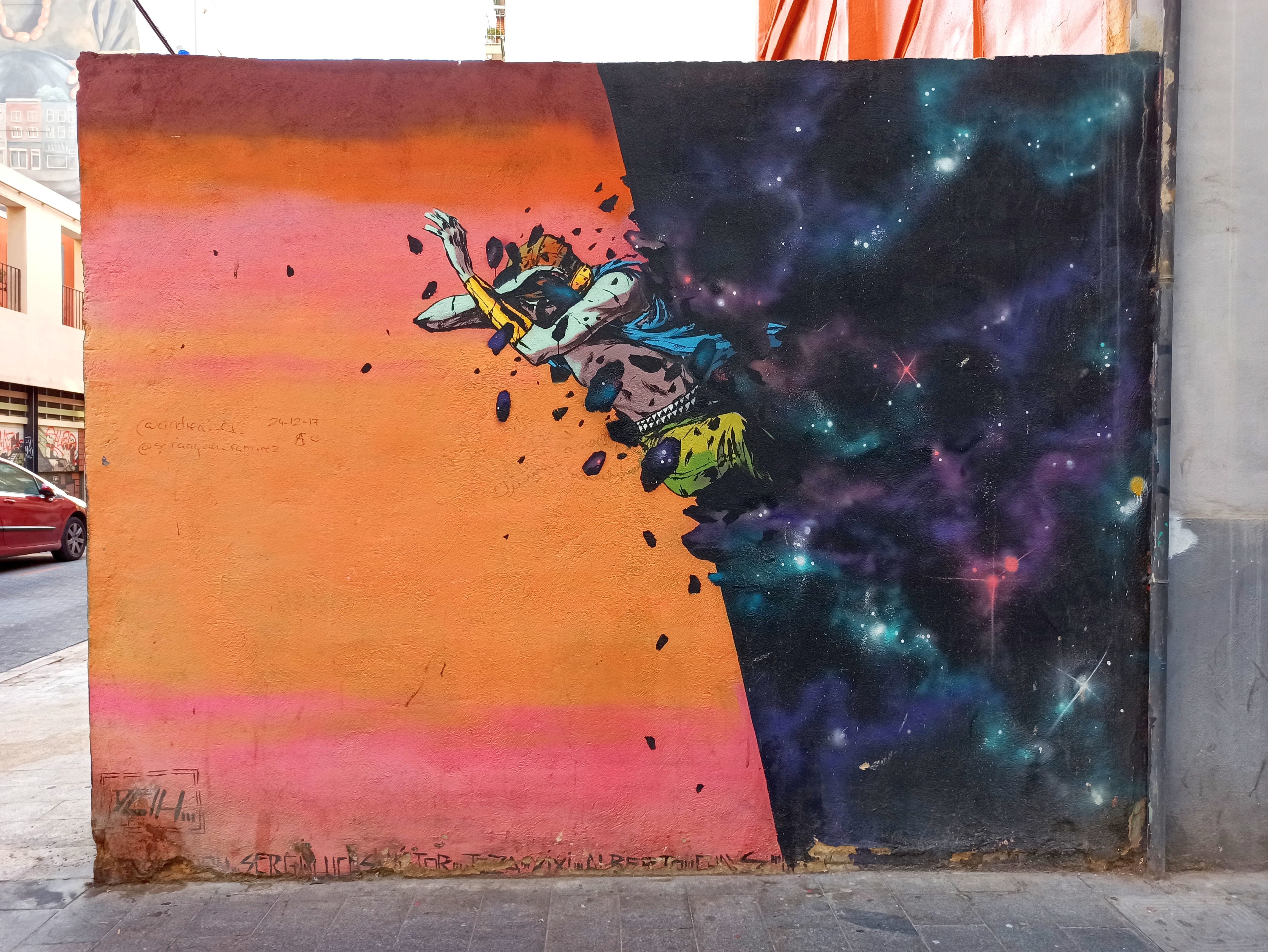 The artwork is of graffiti type. You can admire it in the city of València in Spain and more precisely here : Carrer de na Jordana, 21, 46003 València, Valencia, Spain.