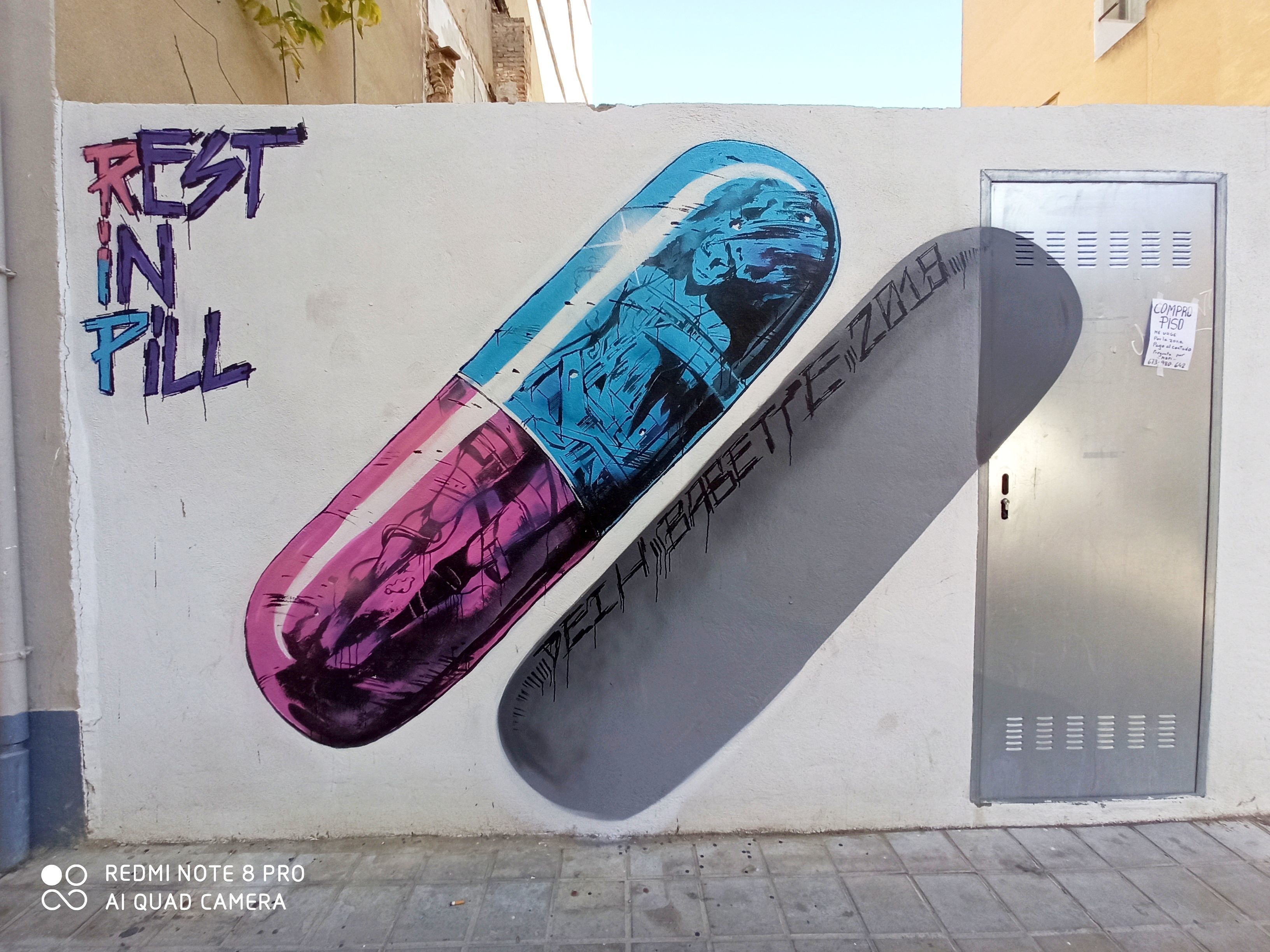 The artwork Rest in Pill is of graffiti type. You can admire it in the city of València in Spain and more precisely here : Carrer de Víctor Pradera, 8-10, 46920 Mislata, València, Spain.