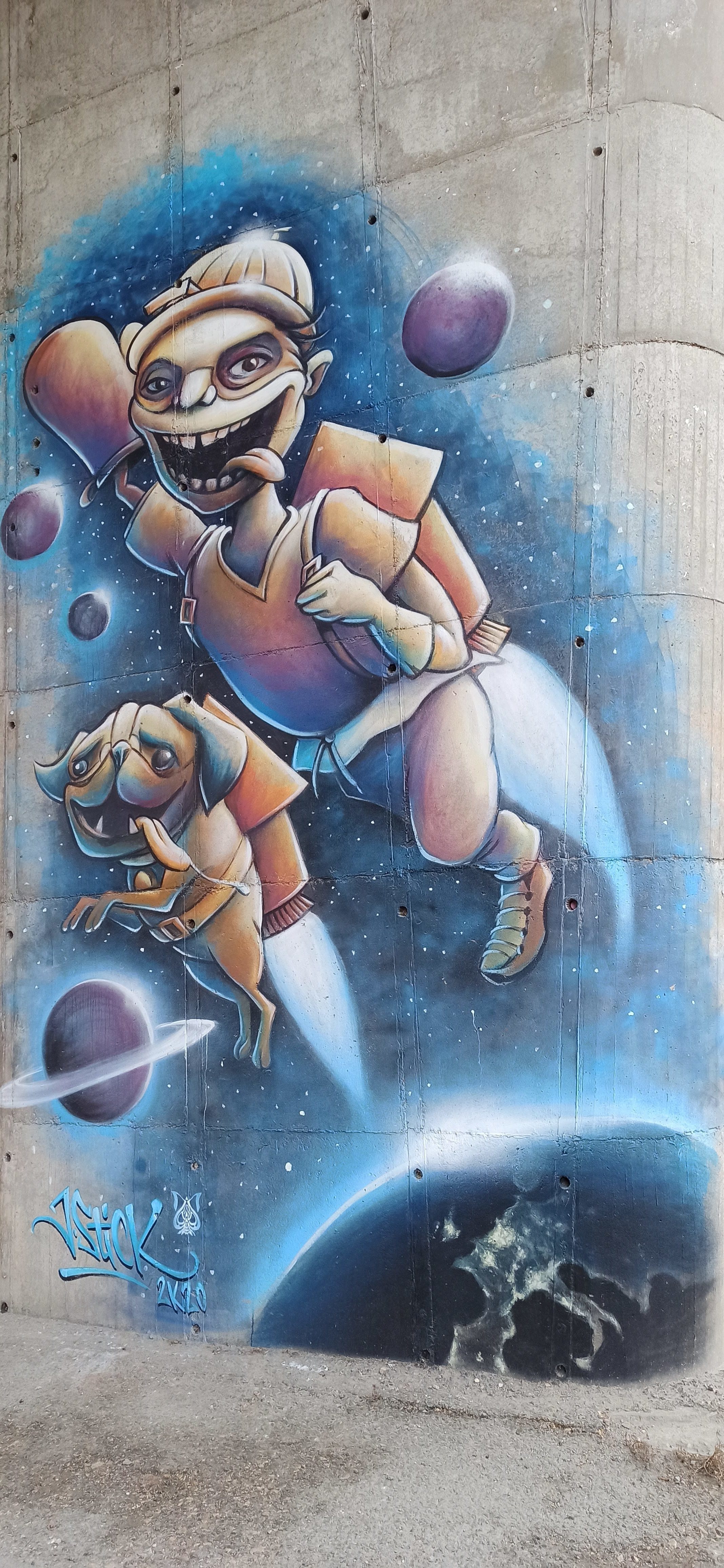 The artwork is of graffiti type. You can admire it in the city of Lorient in France and more precisely here : 70 Boulevard Cosmao Dumanoir, 56100 Lorient, France.