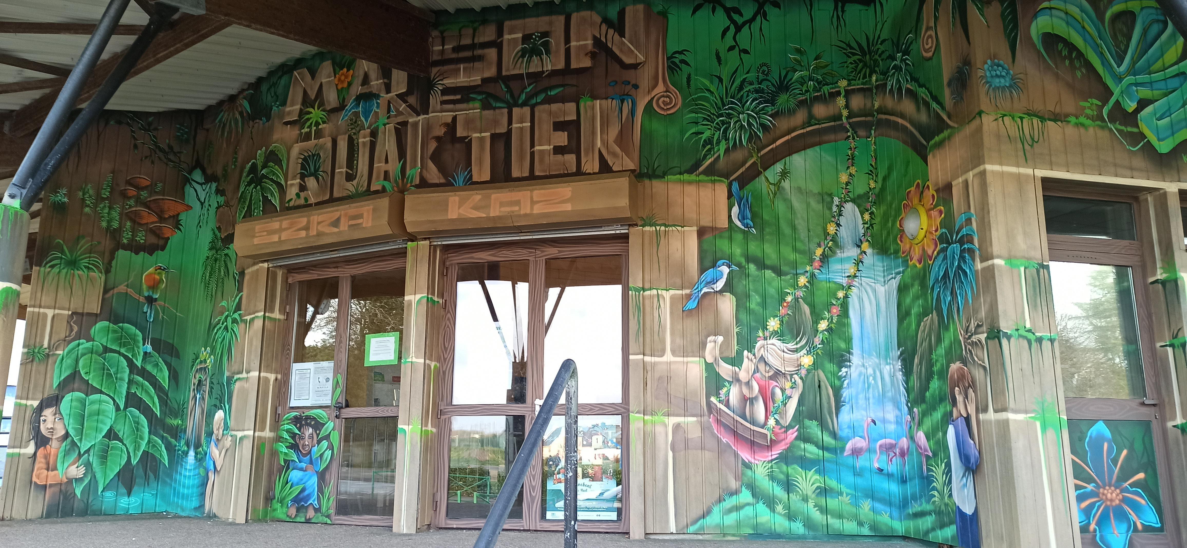 The artwork is of graffiti type. You can admire it in the city of Hennebont in France and more precisely here : Maison de quartier de Kerihouais, 56700 Hennebont, France.