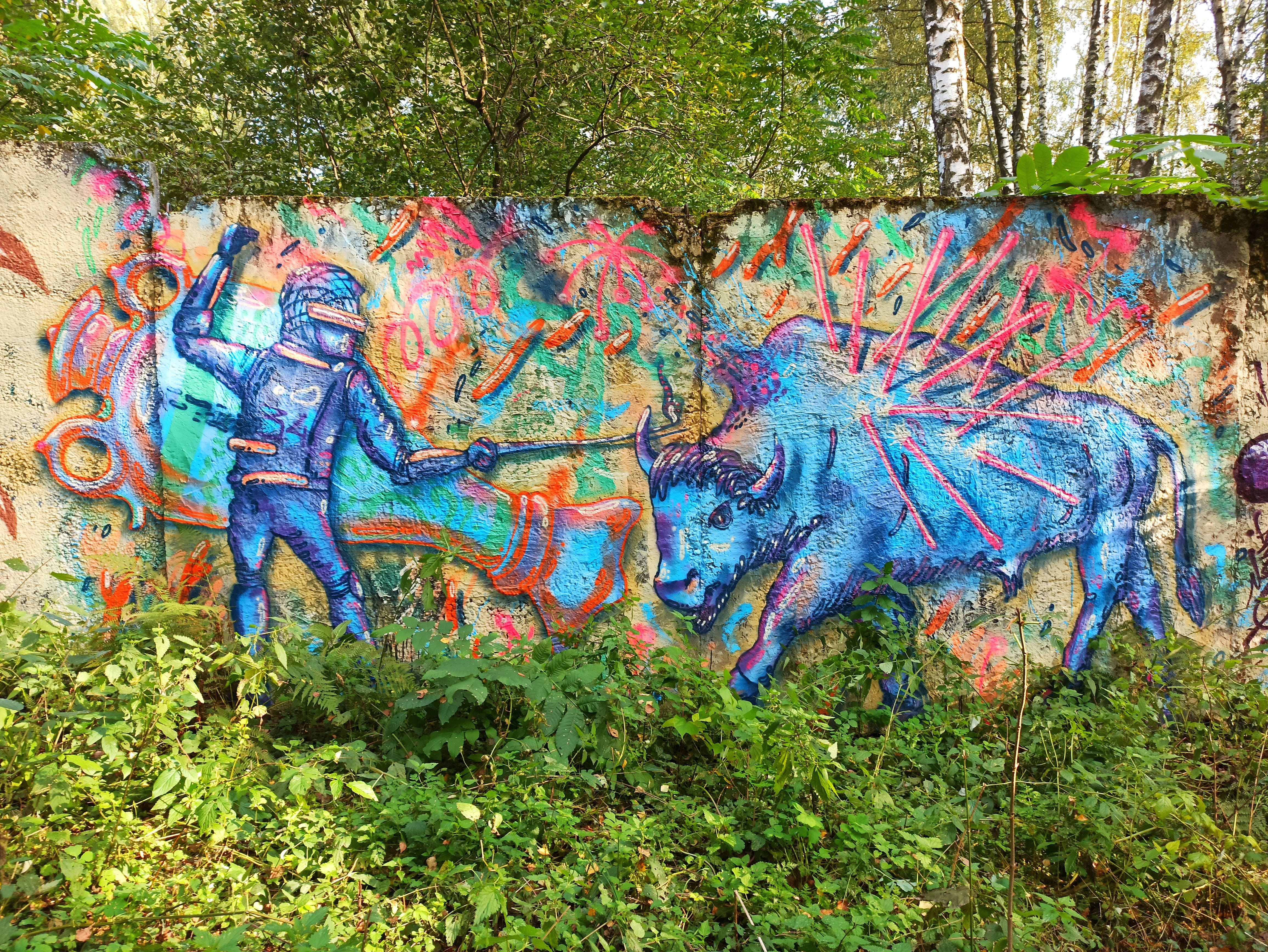 The artwork is of graffiti type. You can admire it in the city of Balashikha in Russia and more precisely here : Fedurnovo, 96Б, 143921 Balashikha, Moscow region, Russia.