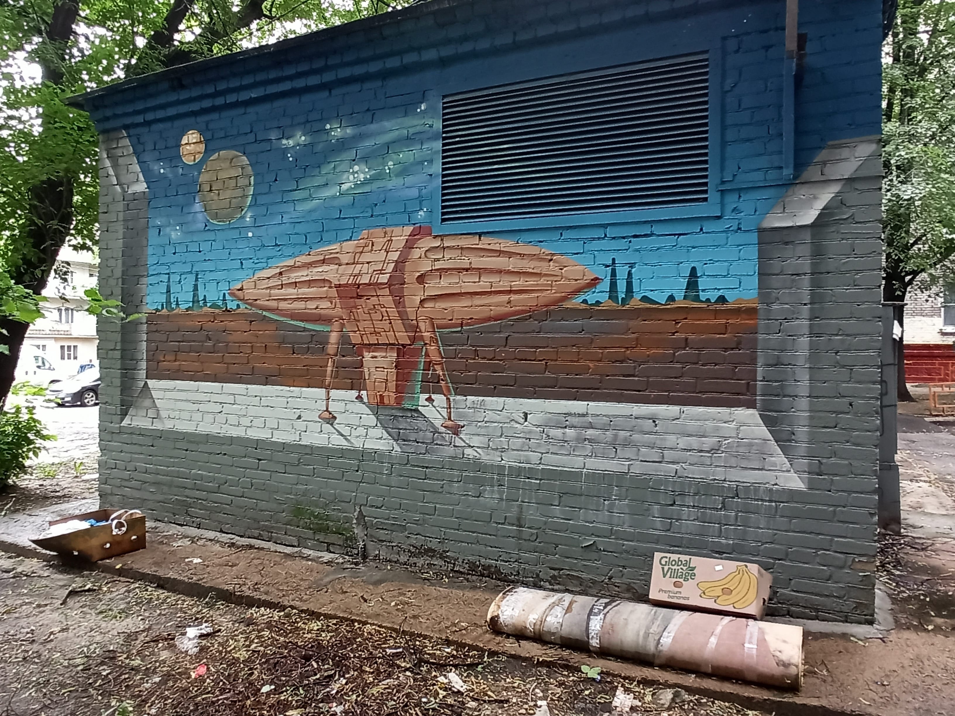 The artwork is of graffiti type. You can admire it in the city of Korolyov in Russia and more precisely here : Grabina st. 4, 141071 Korolyov, Moscow region, Russia.