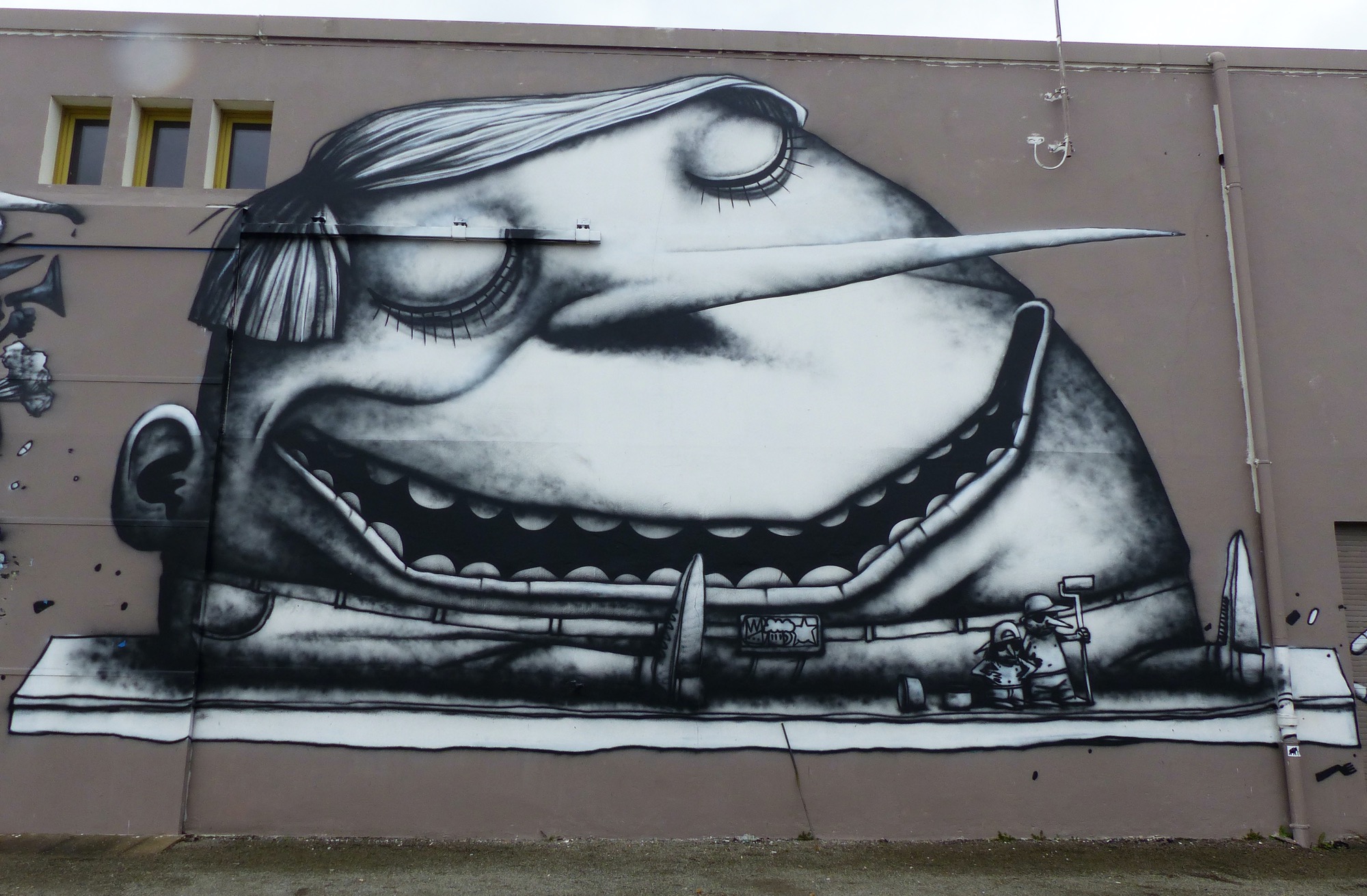 The artwork is of graffiti type. You can admire it in the city of Nantes in France and more precisely here : Quai Marquis d'Aiguillon, 44100 Nantes, France.