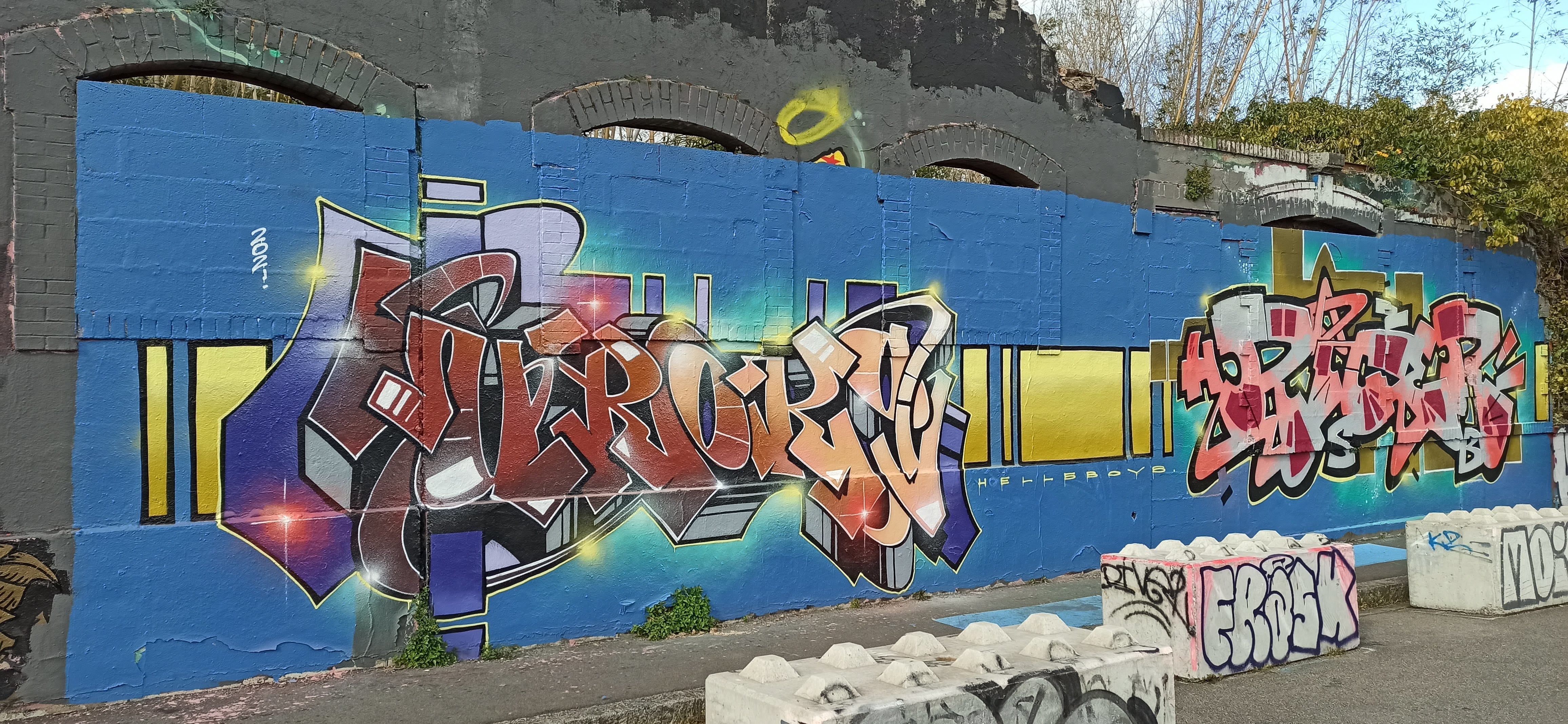 The artwork is of graffiti type. You can admire it in the city of Nantes in France and more precisely here : Carrière Misery, 44100 Nantes, France.
