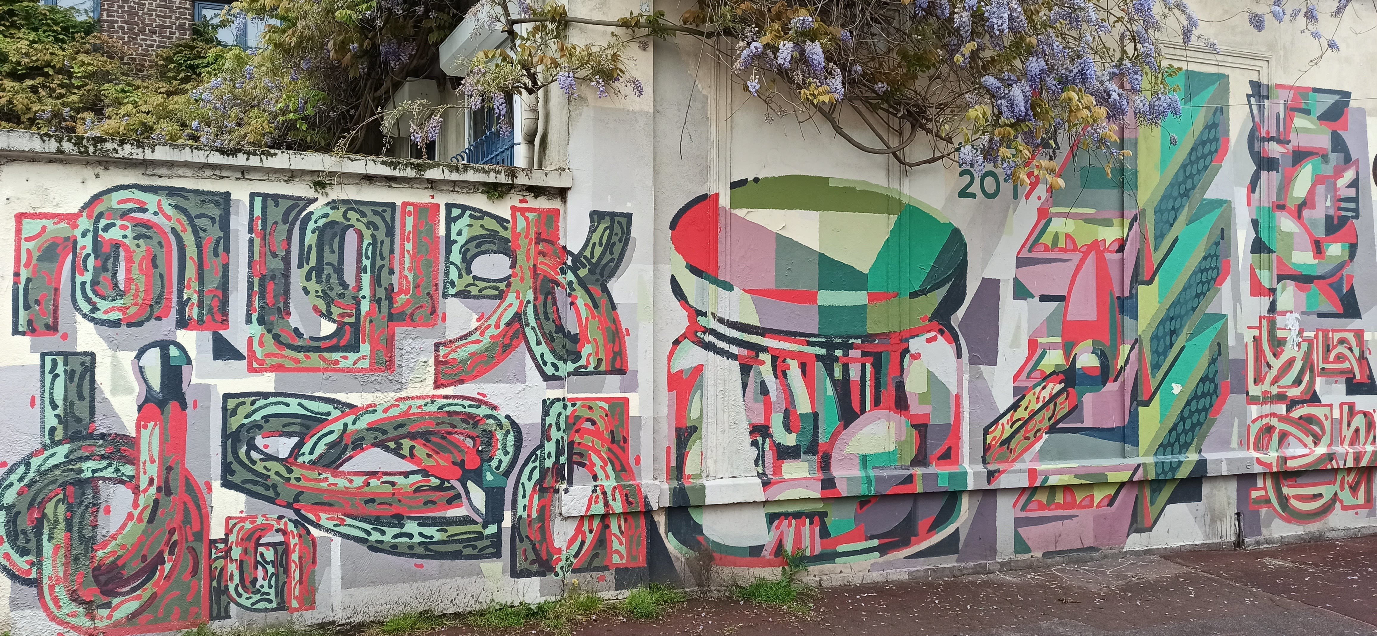 The artwork is of graffiti type. You can admire it in the city of Lille in France and more precisely here : 68 Rue Louis Faure, 59000 Lille, France.