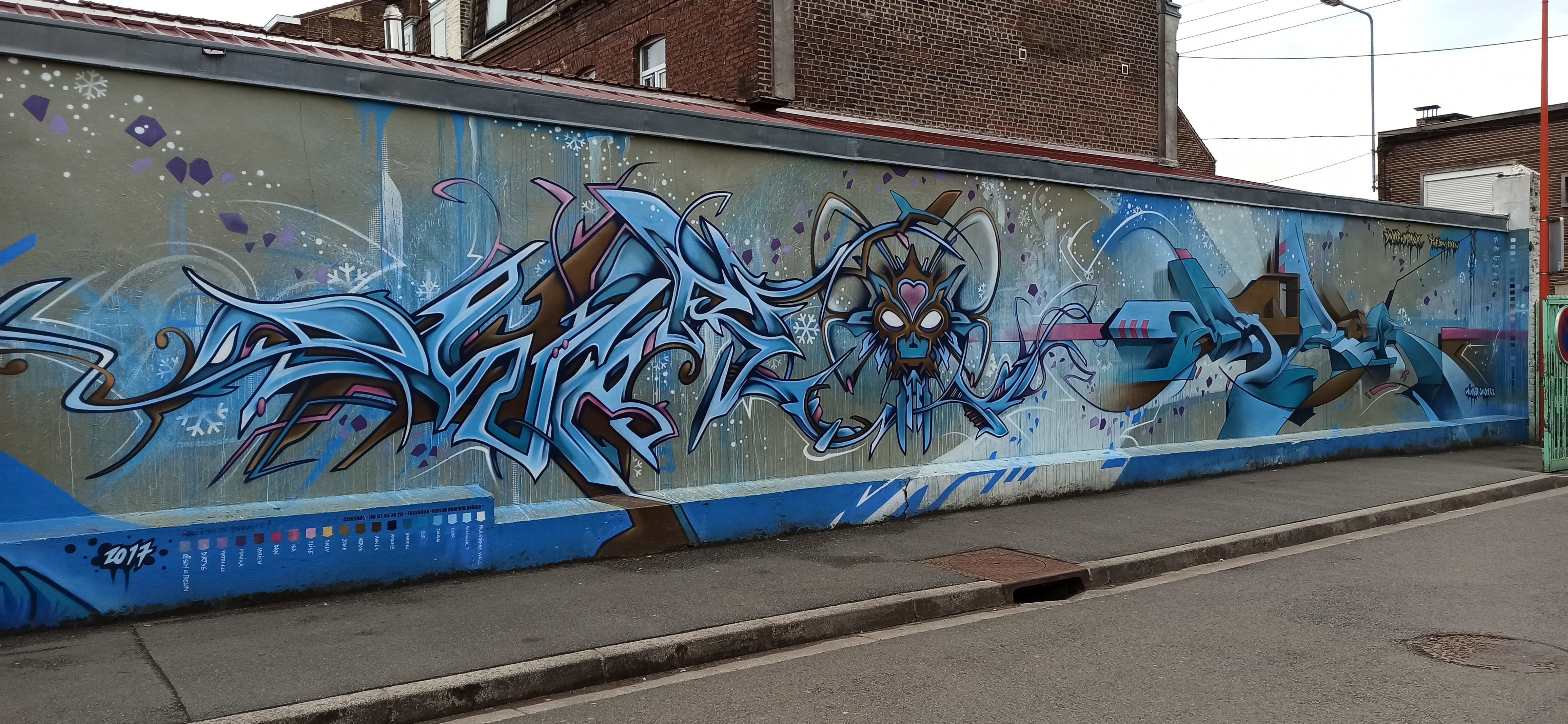 The artwork is of graffiti type. You can admire it in the city of Lille in France and more precisely here : 49 Rue des Écoles, 59260 Lille, France.