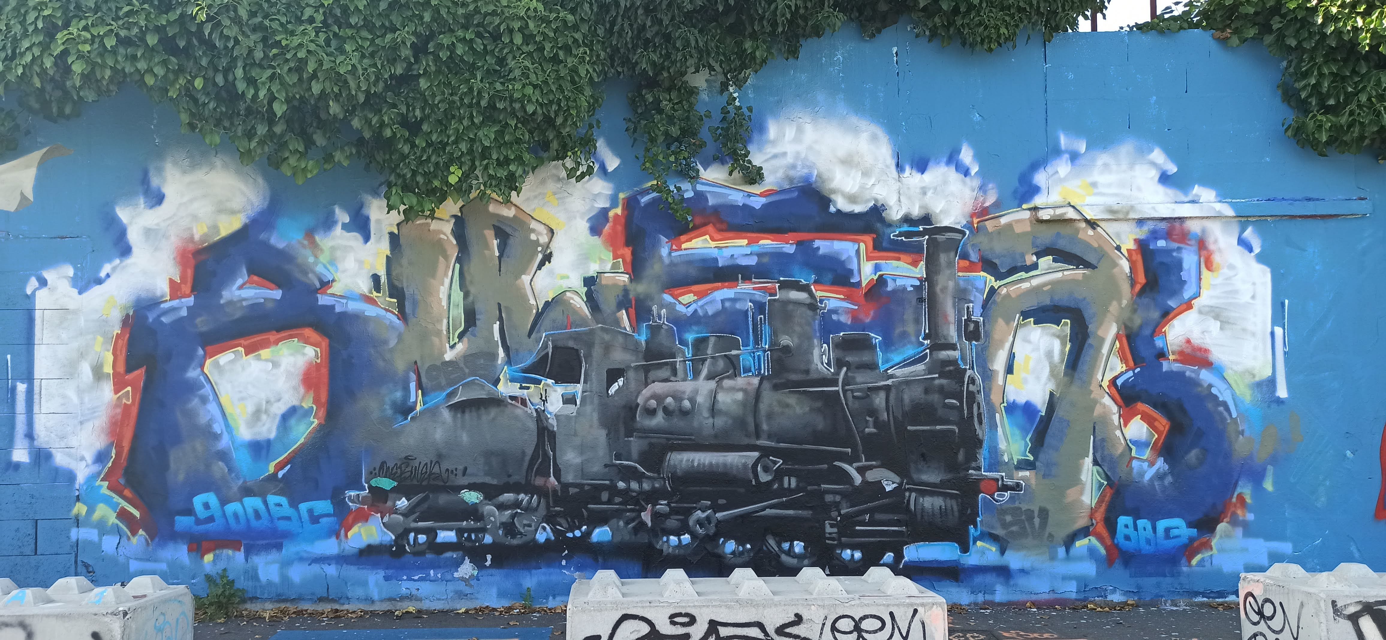 The artwork is of graffiti type. You can admire it in the city of Nantes in France and more precisely here : 21 Bis Bd DuBatonnier, Rue Joseph Cholet, 44100 Nantes, France.