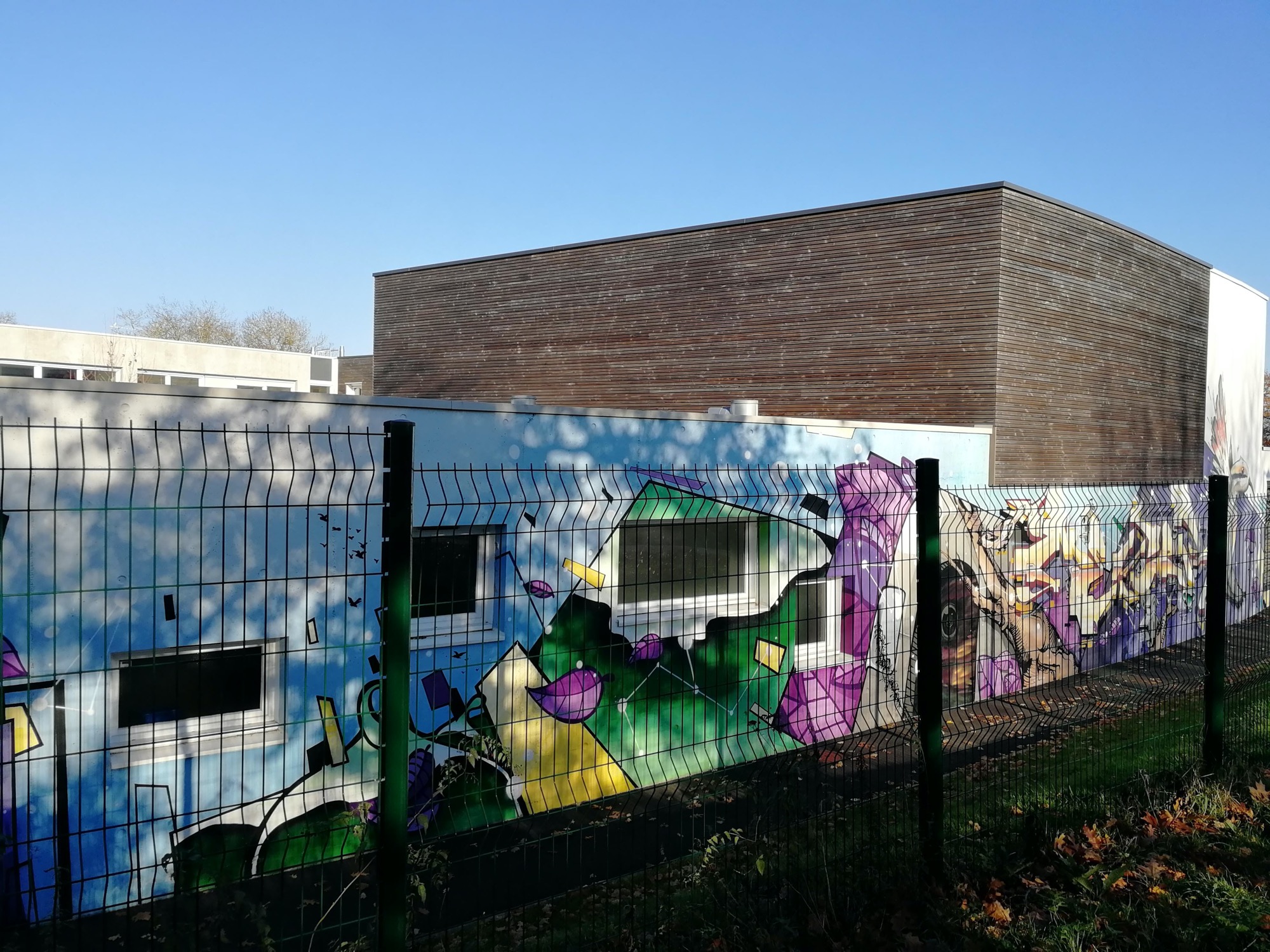 The artwork is of graffiti type. You can admire it in the city of Saint-Herblain in France and more precisely here : 20 Rue Jean Jacques Rousseau, 44800 Saint-Herblain, France.