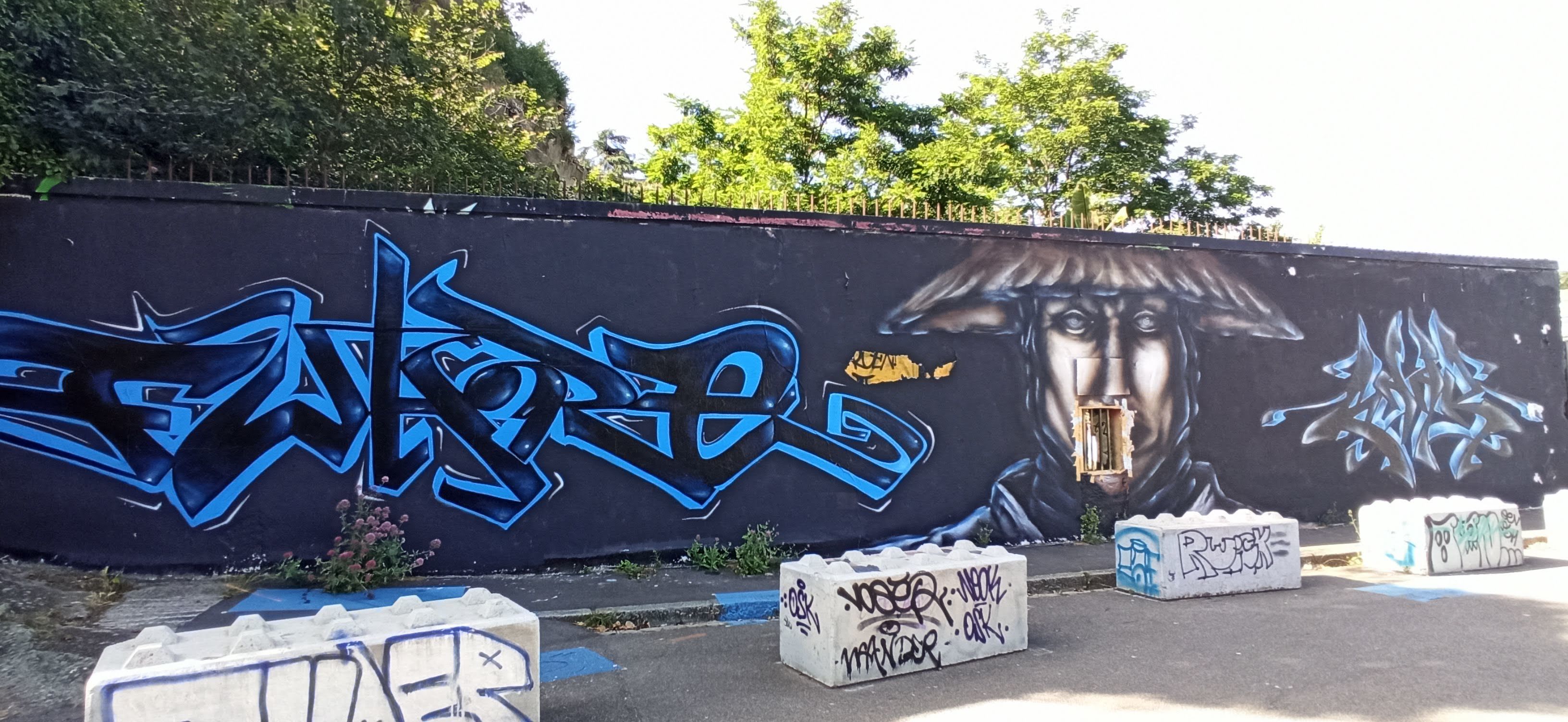 The artwork is of graffiti type. You can admire it in the city of Nantes in France and more precisely here : 21 Bis Bd DuBatonnier, Rue Joseph Cholet, 44100 Nantes, France.